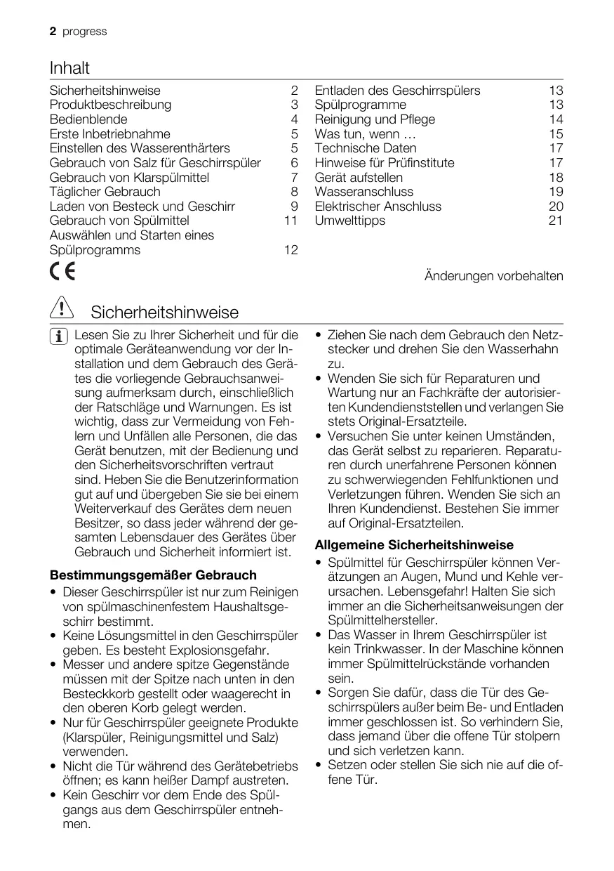 benutzerinformation gebruiksaanwijzing notice d'utilisation user manual Geschirrspüler Afwasmachine Lave-vaisselle Dishwasher PI 1310 2 progress Inhalt Sicherheitshinweise Produktbeschreibung Bedienblende Erste Inbetriebnahme Einstellen des Wasserenthärters Gebrauch von Salz für Geschirrspüler Gebrauch von Klarspülmittel Täglicher Gebrauch Laden von Besteck und Geschirr Gebrauch von Spülmittel Auswählen und Starten eines Spülprogramms