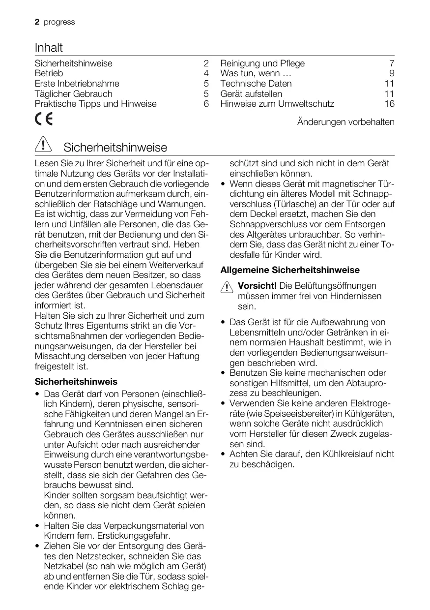 benutzerinformation user manual gebruiksaanwijzing notice d'utilisation Kühl - Gefrierschrank Fridge-Freezer Koelkast-Vriezer Réfrigérateur-congélateur PKG1440 2 progress Inhalt Sicherheitshinweise Betrieb Erste Inbetriebnahme Täglicher Gebrauch Praktische Tipps und Hinweise