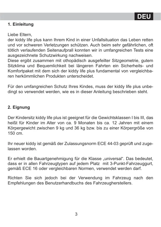 DEU Der Fangkörper muss für Kinder von 9 – 18 kg (ca. 9 Monate bis ca. 4 Jahre) verwendet werden. Verwenden Sie das Sitzkissen nur mit Fangkörper und nur für Kinder mit einem Körpergewicht von 9 - 13 kg. Die Sitzposition (Schutz) würde sich sonst bei einem Unfall verschlechtern. Entfernen Sie niemals die Sitzverlängerung. Sie bietet beim Aufprall einen wirksamen Schutz gegen das Durchtauchen des Körpers unter dem Beckengurt bzw. Fangkörper. Überprüfen Sie vor jeder Fahrt, ob das Kinderrückhaltesystem optimal zur Körpergröße des Kindes eingestellt ist. Nehmen Sie keine Einstellungen während der Fahrt vor. Stellen Sie sicher, dass alle Teile stets ordnungsgemäß eingerastet sind. Überprüfen Sie die Elemente des Kiddy regelmäßig auf Abnutzung oder sonstige Schäden. Stellen Sie sicher, dass keine Teile des Kiddy in Türen oder verstellbaren Sitzen eingeklemmt werden. Achten Sie, vor allem bei Vans und Caravans darauf, dass der Kiddy im Falle einer Rettung durch Dritte möglichst an einem leicht zugänglichen Platz eingebaut ist. Verwenden Sie Ihren kiddy ausschließlich für die angegebene Gewichtsklasse bis max. 36 kg. Der Gurt darf niemals locker anliegen. Bei einem Unfall sind die Belastungen der Körperteile um ein Vielfaches höher als bei einem straffen Gurt. Bitte achten Sie auf die korrekte Lage des Gurtschlosses. Lassen Sie Ihr Kind nie unbeaufsichtigt im Kiddy.