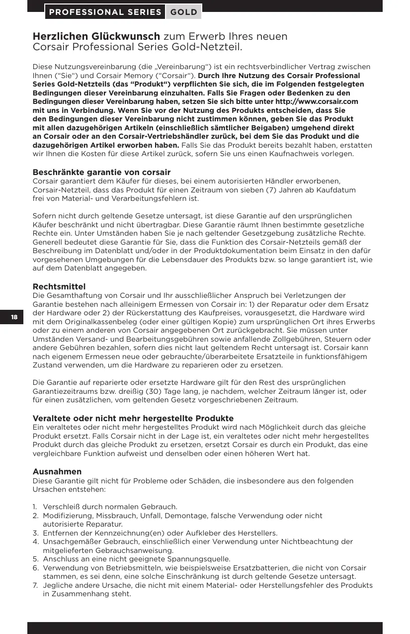 PROFESSIONAL SERIES GOLD Herzlichen Glückwunsch zum Erwerb Ihres neuen Corsair Professional Series Gold-Netzteil. Diese Nutzungsvereinbarung (die „Vereinbarung“) ist ein rechtsverbindlicher Vertrag zwischen Ihnen (“Sie“) und Corsair Memory (“Corsair“). Durch Ihre Nutzung des Corsair Professional Series Gold-Netzteils (das “Produkt“) verpflichten Sie sich, die im Folgenden festgelegten Bedingungen dieser Vereinbarung einzuhalten. Falls Sie Fragen oder Bedenken zu den Bedingungen dieser Vereinbarung haben, setzen Sie sich bitte unter http://www.corsair.com mit uns in Verbindung. Wenn Sie vor der Nutzung des Produkts entscheiden, dass Sie den Bedingungen dieser Vereinbarung nicht zustimmen können, geben Sie das Produkt mit allen dazugehörigen Artikeln (einschließlich sämtlicher Beigaben) umgehend direkt an Corsair oder an den Corsair-Vertriebshändler zurück, bei dem Sie das Produkt und die dazugehörigen Artikel erworben haben. Falls Sie das Produkt bereits bezahlt haben, erstatten wir Ihnen die Kosten für diese Artikel zurück, sofern Sie uns einen Kaufnachweis vorlegen. Beschränkte garantie von corsair Corsair garantiert dem Käufer für dieses, bei einem autorisierten Händler erworbenen, Corsair-Netzteil, dass das Produkt für einen Zeitraum von sieben (7) Jahren ab Kaufdatum frei von Material- und Verarbeitungsfehlern ist. Sofern nicht durch geltende Gesetze untersagt, ist diese Garantie auf den ursprünglichen Käufer beschränkt und nicht übertragbar. Diese Garantie räumt Ihnen bestimmte gesetzliche Rechte ein. Unter Umständen haben Sie je nach geltender Gesetzgebung zusätzliche Rechte. Generell bedeutet diese Garantie für Sie, dass die Funktion des Corsair-Netzteils gemäß der Beschreibung im Datenblatt und/oder in der Produktdokumentation beim Einsatz in den dafür vorgesehenen Umgebungen für die Lebensdauer des Produkts bzw. so lange garantiert ist, wie auf dem Datenblatt angegeben. Rechtsmittel