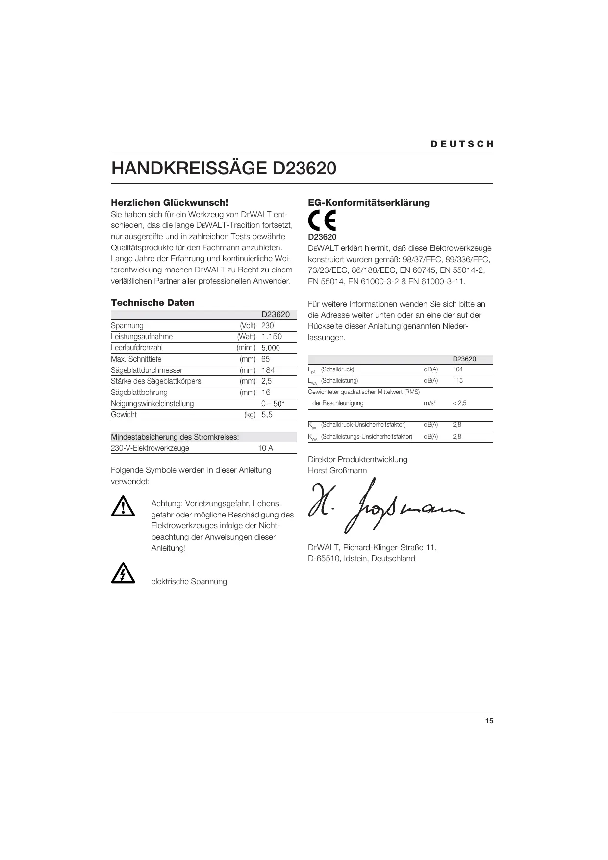 m/s2 < 2,5 KpA (Schalldruck-Unsicherheitsfaktor) dB(A) 2,8 KWA (Schalleistungs-Unsicherheitsfaktor) dB(A) 2,8 Gewichteter quadratischer Mittelwert (RMS) der Beschleunigung 10 A Folgende Symbole werden in dieser Anleitung verwendet: Achtung: Verletzungsgefahr, Lebensgefahr oder mögliche Beschädigung des Elektrowerkzeuges infolge der Nichtbeachtung der Anweisungen dieser Anleitung! Direktor Produktentwicklung Horst Großmann DEWALT, Richard-Klinger-Straße 11, D-65510, Idstein, Deutschland elektrische Spannung