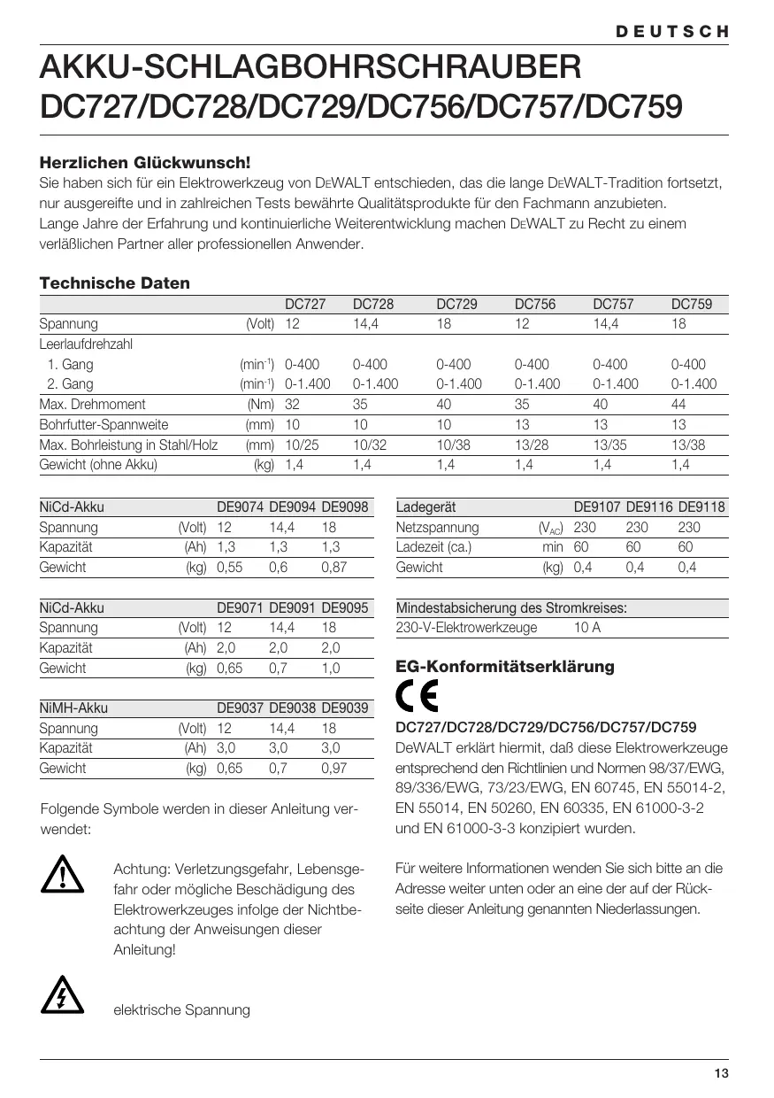 - At dateret købsnota forevises. Denne garanti tilbydes som en ekstra service og er et tillæg til forbrugerens øvrige rettigheder. Oplysninger om nærmeste DEWALT-autoriserede serviceværksted, se aktuelt katalog for videre information eller kontakt DEWALT. Alternativt kan De også finde en liste over DEWALT-autoriserede serviceværksteder og detaljer om vor eftersalgsservice på Internettet på følgende adresse: www.2helpU.com. DEUTSCH AKKU-SCHLAGBOHRSCHRAUBER DC727/DC728/DC729/DC756/DC757/DC759 Herzlichen Glückwunsch! Sie haben sich für ein Elektrowerkzeug von DEWALT entschieden, das die lange DEWALT-Tradition fortsetzt, nur ausgereifte und in zahlreichen Tests bewährte Qualitätsprodukte für den Fachmann anzubieten. Lange Jahre der Erfahrung und kontinuierliche Weiterentwicklung machen DEWALT zu Recht zu einem verläßlichen Partner aller professionellen Anwender. Technische Daten Spannung Leerlaufdrehzahl