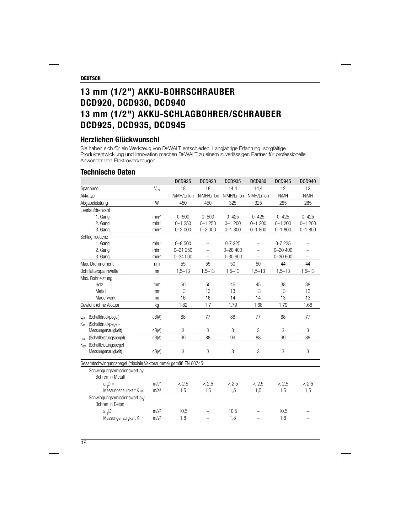 Herzlichen Glückwunsch! Sie haben sich für ein Werkzeug von DEWALT entschieden. Langjährige Erfahrung, sorgfältige Produktentwicklung und Innovation machen DEWALT zu einem zuverlässigen Partner für professionelle Anwender von Elektrowerkzeugen. Technische Daten