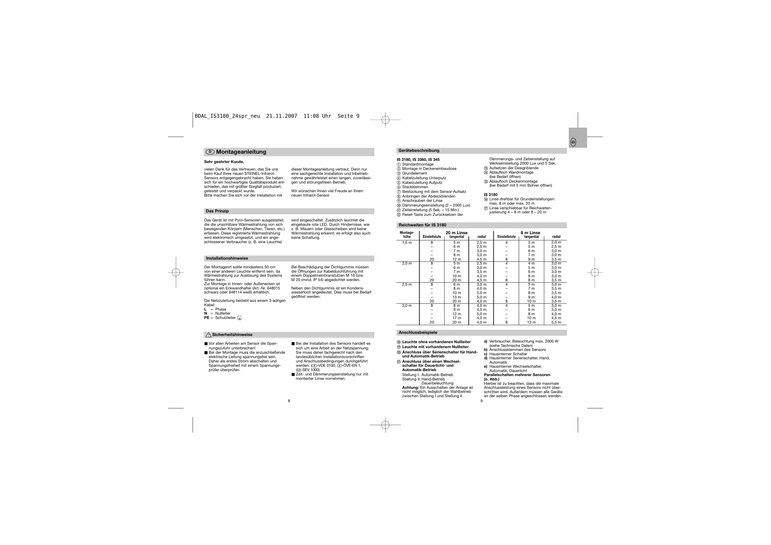Gerätebeschreibung Montageanleitung Sehr geehrter Kunde, vielen Dank für das Vertrauen, das Sie uns beim Kauf Ihres neuen STEINEL-InfrarotSensors entgegengebracht haben. Sie haben sich für ein hochwertiges Qualitätsprodukt entschieden, das mit größter Sorgfalt produziert, getestet und verpackt wurde. Bitte machen Sie sich vor der Installation mit dieser Montageanleitung vertraut. Denn nur eine sachgerechte Installation und Inbetriebnahme gewährleistet einen langen, zuverlässigen und störungsfreien Betrieb. Wir wünschen Ihnen viel Freude an Ihrem neuen Infrarot-Sensor. Das Prinzip Das Gerät ist mit Pyro-Sensoren ausgestattet, die die unsichtbare Wärmestrahlung von sich bewegenden Körpern (Menschen, Tieren, etc.) erfassen. Diese registrierte Wärmestrahlung wird elektronisch umgesetzt, und ein angeschlossener Verbraucher (z. B. eine Leuchte) wird eingeschaltet. Zusätzlich leuchtet die eingebaute rote LED. Durch Hindernisse, wie z. B. Mauern oder Glasscheiben wird keine Wärmestrahlung erkannt, es erfolgt also auch keine Schaltung. Montagehöhe 1,5 m 2,0 m Bei Beschädigung der Dichtgummis müssen die Öffnungen zur Kabeldurchführung mit einem Doppelmembranstutzen M 16 bzw. M 20 (mind. IP 54) abgedichtet werden. 2,5 m Neben den Dichtgummis ist ein Kondenswasserloch angedeutet. Dies muss bei Bedarf geöffnet werden. Die Netzzuleitung besteht aus einem 3-adrigen Kabel: L = Phase N = Nullleiter PE = Schutzleiter IS 3180 Linse drehbar für Grundeinstellungen: max. 8 m oder max. 20 m Linse verschiebbar für Reichweitenjustierung 4 – 8 m oder 8 – 20 m Reichweiten für IS 3180 Installationshinweise Der Montageort sollte mindestens 50 cm von einer anderen Leuchte entfernt sein, da Wärmestrahlung zur Auslösung des Systems führen kann. Zur Montage in Innen- oder Außenecken ist optional ein Eckwandhalter (Art.-Nr. 648015 schwarz oder 648114 weiß) erhältlich. Dämmerungs- und Zeiteinstellung auf Werkseinstellung 2000 Lux und 5 Sek. Aufsetzen der Designblende Ablaufloch Wandmontage (bei Bedarf öffnen) Ablaufloch Deckenmontage (bei Bedarf mit 5 mm Bohrer öffnen) IS 3180, IS 3360, IS 345 Standardmontage Montage in Deckeneinbaudose Grundelement Kabelzuleitung Unterputz Kabelzuleitung Aufputz Steckklemmen Bestückung mit dem Sensor-Aufsatz Anbringen der Abdeckblenden Anschrauben der Linse Dämmerungseinstellung (2 – 2000 Lux) Zeiteinstellung (5 Sek. – 15 Min.) Reset-Taste zum Zurücksetzen der 3,0 m 20 m Linse Einstellstufe