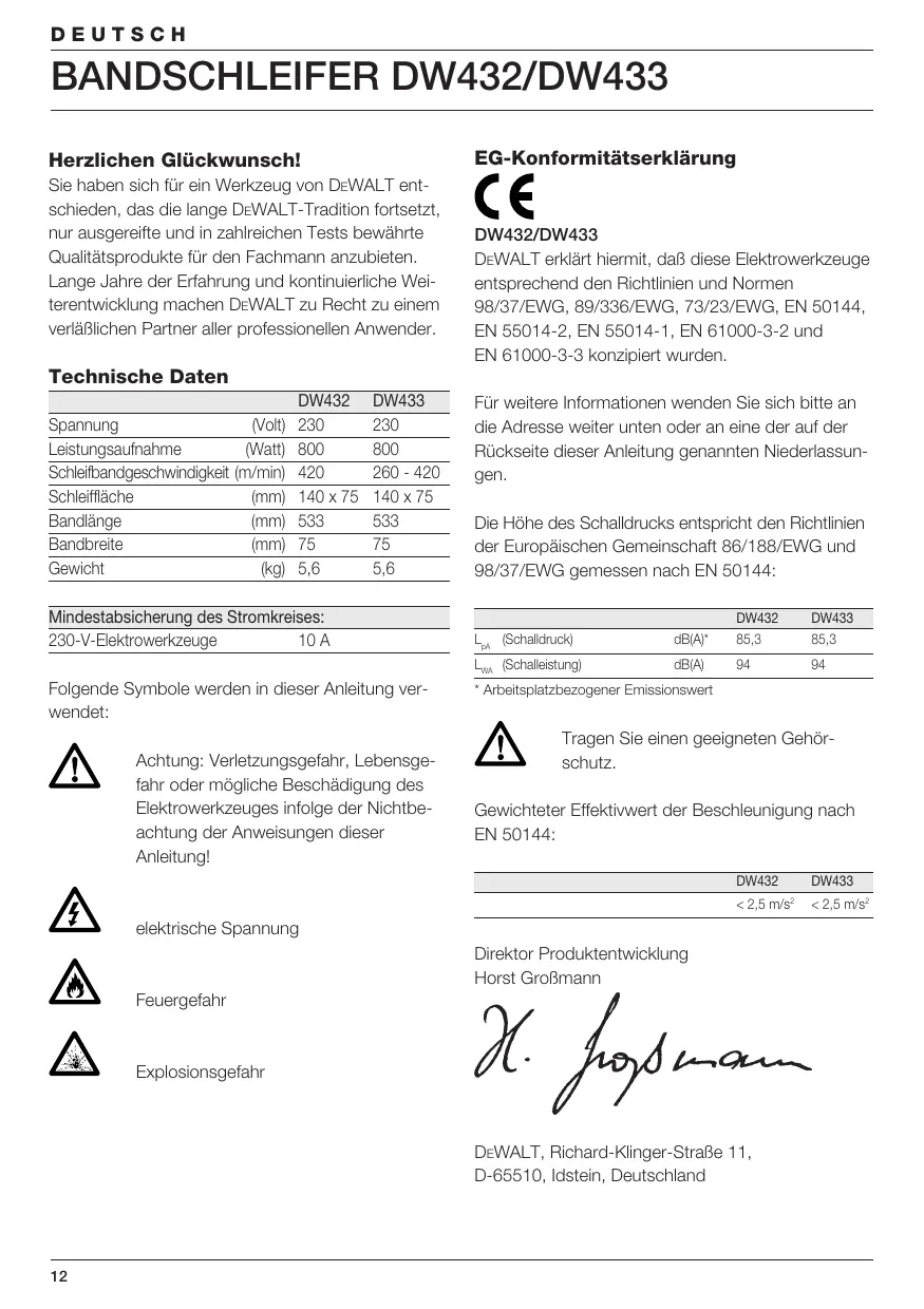Opgenomen vermogen W_800 800 Neem voor meer informatie contact op met DEWALT, Bandsnelheid m/min_420 260-420 zie het adres hieronder of op de achterkant van deze EN 55014-2, EN 55014-1, EN 61000-3-2 &