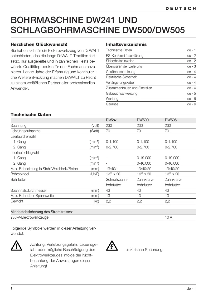 Drehzahl-Regelschalter Arretierung EIN-/AUS-Schalter Rechts-/Linkslauf-Umschalter Getriebeumschalter 1./2. Gang Getriebeumschalter Bohren/Schlagbohren (DW500/DW505) Zusatzhandgriff Bohrtiefenanschlag Zahnkranzbohrfutter Schnellspannbohrfutter Spannring Bohrfutterschlüssel Aufhängehaken Elektrische Sicherheit Der Elektromotor wurde nur für eine Spannung konzipiert. Überprüfen Sie deswegen, ob die Netzspannung der auf dem Typenschild des Elektrowerkzeuges angegebenen Spannung entspricht. Ihr DEWALT-Elektrowerkzeug ist gemäß EN 50144 zweifach isoliert; ein Erdleiter ist aus diesem Grunde überflüssig.