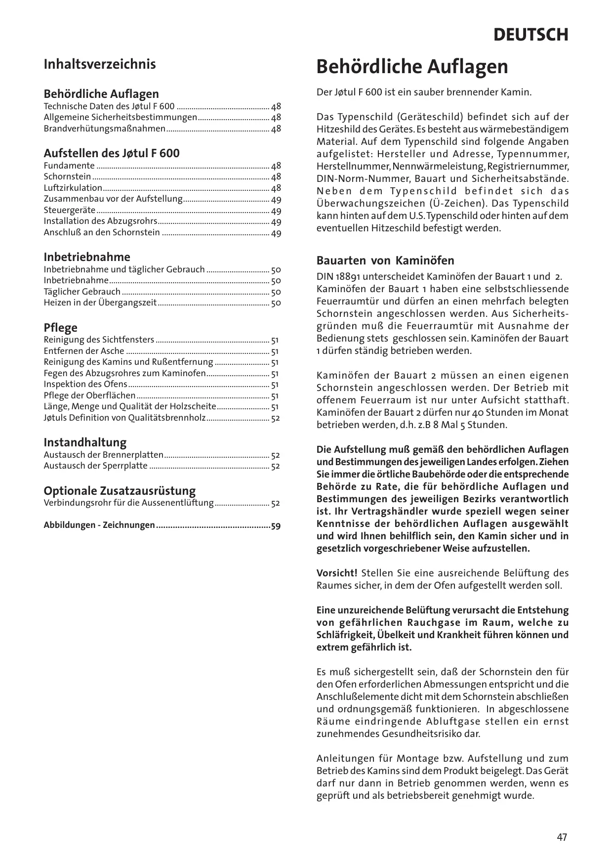 - Posizionare poi la copertura isolante sopra le piastre del parafiamma. Attrezzatura facoltativa Condotto di collegamento per la ventilazione esterna codice cat. 221032 Con l’aiuto di un condotto di collegamento per la ventilazione esterna e di tubo flessibile, è possibile convogliare all’elemento l’aria di combustione direttamente dall’esterno. In questo modo nella stufa sarà sempre presente una quantità di aria tale da permettere un’adeguata combustione. deutsch Inhaltsverzeichnis Behördliche Auflagen Behördliche Auflagen Der Jøtul F 600 ist ein sauber brennender Kamin. Technische Daten des Jøtul F 600 ............................................ 48 Allgemeine Sicherheitsbestimmungen................................... 48 Brandverhütungsmaßnahmen.................................................. 48 Fundamente................................................................................... 48 Schornstein..................................................................................... 48 Luftzirkulation................................................................................ 48 Zusammenbau vor der Aufstellung.......................................... 49 Steuergeräte................................................................................... 49 Installation des Abzugsrohrs...................................................... 49 Anschluß an den Schornstein.................................................... 49 Das Typenschild (Geräteschild) befindet sich auf der Hitzeshild des Gerätes. Es besteht aus wärmebeständigem Material. Auf dem Typenschild sind folgende Angaben aufgelistet: Hersteller und Adresse, Typennummer, Herstellnummer, Nennwärmeleistung, Registriernummer, DIN-Norm-Nummer, Bauart und Sicherheitsabstände. N e b e n d e m Ty p e n s c h i l d b e f i n d e t s i c h d a s Überwachungszeichen (Ü-Zeichen). Das Typenschild kann hinten auf dem U.S. Typenschild oder hinten auf dem eventuellen Hitzeschild befestigt werden. Inbetriebnahme Bauarten von Kaminöfen Aufstellen des Jøtul F 600 Inbetriebnahme und täglicher Gebrauch............................... 50 Inbetriebnahme............................................................................. 50 Täglicher Gebrauch....................................................................... 50 Heizen in der Übergangszeit...................................................... 50 Pflege Reinigung des Sichtfensters....................................................... 51 Entfernen der Asche..................................................................... 51 Reinigung des Kamins und Rußentfernung........................... 51 Fegen des Abzugsrohres zum Kaminofen............................... 51 Inspektion des Ofens.................................................................... 51 Pflege der Oberflächen................................................................ 51 Länge, Menge und Qualität der Holzscheite.......................... 51 Jøtuls Definition von Qualitätsbrennholz............................... 52 Instandhaltung Austausch der Brennerplatten................................................... 52 Austausch der Sperrplatte.......................................................... 52 Optionale Zusatzausrüstung Verbindungsrohr für die Aussenentlüftung........................... 52 Abbildungen - Zeichnungen.................................................59 DIN 18891 unterscheidet Kaminöfen der Bauart 1 und 2. Kaminöfen der Bauart 1 haben eine selbstschliessende Feuerraumtür und dürfen an einen mehrfach belegten Schornstein angeschlossen werden. Aus Sicherheitsgründen muß die Feuerraumtür mit Ausnahme der Bedienung stets geschlossen sein. Kaminöfen der Bauart 1 dürfen ständig betrieben werden. Kaminöfen der Bauart 2 müssen an einen eigenen Schornstein angeschlossen werden. Der Betrieb mit offenem Feuerraum ist nur unter Aufsicht statthaft. Kaminöfen der Bauart 2 dürfen nur 40 Stunden im Monat betrieben werden, d.h. z.B 8 Mal 5 Stunden. Die Aufstellung muß gemäß den behördlichen Auflagen und Bestimmungen des jeweiligen Landes erfolgen. Ziehen Sie immer die örtliche Baubehörde oder die entsprechende Behörde zu Rate, die für behördliche Auflagen und Bestimmungen des jeweiligen Bezirks verantwortlich ist. Ihr Vertragshändler wurde speziell wegen seiner Kenntnisse der behördlichen Auflagen ausgewählt und wird Ihnen behilflich sein, den Kamin sicher und in gesetzlich vorgeschriebener Weise aufzustellen. Vorsicht! Stellen Sie eine ausreichende Belüftung des Raumes sicher, in dem der Ofen aufgestellt werden soll. Eine unzureichende Belüftung verursacht die Entstehung von gefährlichen Rauchgase im Raum, welche zu Schläfrigkeit, Übelkeit und Krankheit führen können und extrem gefährlich ist. Es muß sichergestellt sein, daß der Schornstein den für den Ofen erforderlichen Abmessungen entspricht und die Anschlußelemente dicht mit dem Schornstein abschließen und ordnungsgemäß funktionieren. In abgeschlossene Räume eindringende Abluftgase stellen ein ernst zunehmendes Gesundheitsrisiko dar. Anleitungen für Montage bzw. Aufstellung und zum Betrieb des Kamins sind dem Produkt beigelegt. Das Gerät darf nur dann in Betrieb genommen werden, wenn es geprüft und als betriebsbereit genehmigt wurde.