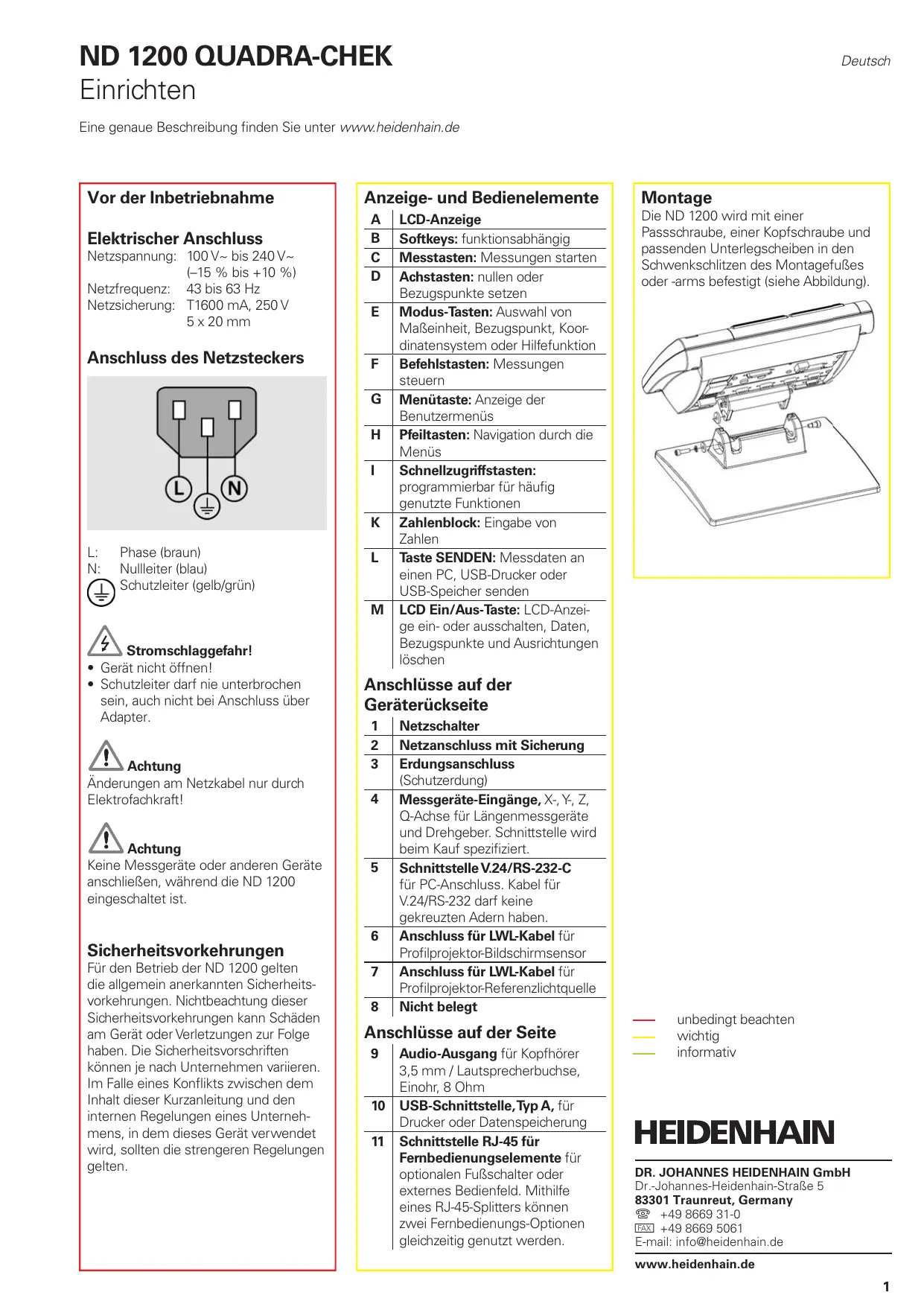 - Press the SEND key to report results. ND 1200 QUADRA-CHEK Einrichten Deutsch Eine genaue Beschreibung finden Sie unter www.heidenhain.de Vor der Inbetriebnahme Elektrischer Anschluss Netzspannung: 100 V~ bis 240 V~ (–15 % bis +10 %) Netzfrequenz: 43 bis 63 Hz Netzsicherung: T1600 mA, 250 V 5 x 20 mm Anschluss des Netzsteckers Anzeige- und Bedienelemente