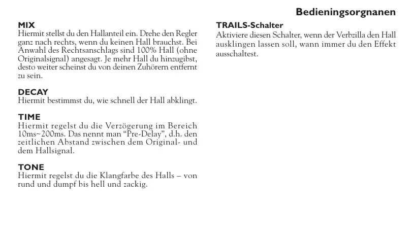 Bedieningsorgnanen MIX Hiermit stellst du den Hallanteil ein. Drehe den Regler ganz nach rechts, wenn du keinen Hall brauchst. Bei Anwahl des Rechtsanschlags sind 100% Hall (ohne Originalsignal) angesagt. Je mehr Hall du hinzugibst, desto weiter scheinst du von deinen Zuhörern entfernt zu sein. DECAY Hiermit bestimmst du, wie schnell der Hall abklingt. TIME Hiermit regelst du die Verzögerung im Bereich 10ms~200ms. Das nennt man “Pre-Delay”, d.h. den zeitlichen Abstand zwischen dem Original- und dem Hallsignal. TONE Hiermit regelst du die Klangfarbe des Halls – von rund und dumpf bis hell und zackig. TRAILS-Schalter Aktiviere diesen Schalter, wenn der Verbzilla den Hall ausklingen lassen soll, wann immer du den Effekt ausschaltest. Verbzilla-Pilotenhandbuch Funktionsregler MIX TONE DECAY TIME