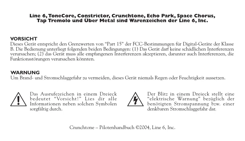 Line 6, ToneCore, Constrictor, Crunchtone, Echo Park, Space Chorus, Tap Tremolo und Über Metal sind Warenzeichen der Line 6, Inc. VORSICHT Dieses Gerät entspricht den Grenzwerten von “Part 15 der FCC-Bestimmungen für Digital-Geräte der Klasse B. Die Bedienung unterliegt folgenden beiden Bedingungen: (1) Das Gerät darf keine schädlichen Interferenzen verursachen: (2) das Gerät muss alle empfangenen Interferenzen akzeptieren, darunter auch Interferenzen, die Funktionsstrungen verursachen künnten. WARNUNG Um Brand- und Stromschlaggefahr zu vermeiden, dieses Gerät niemals Regen oder Feuchtigkeit aussetzen. Das Ausrufezeichen in einem Dreieck Der Blitz in einem Dreieck srellt eine A bedeutet “Vorsicht!” Lies dir alle A “elektrische Warnung” bezüglich der Informationen neben solchen Symbolen benôtigten Stromspannung bzw. einer sorgfältig durch. denkbaren Stromschlaggefahr dar. Crunchtone — Pilotenhandbuch ©2004, Line 6, Inc.