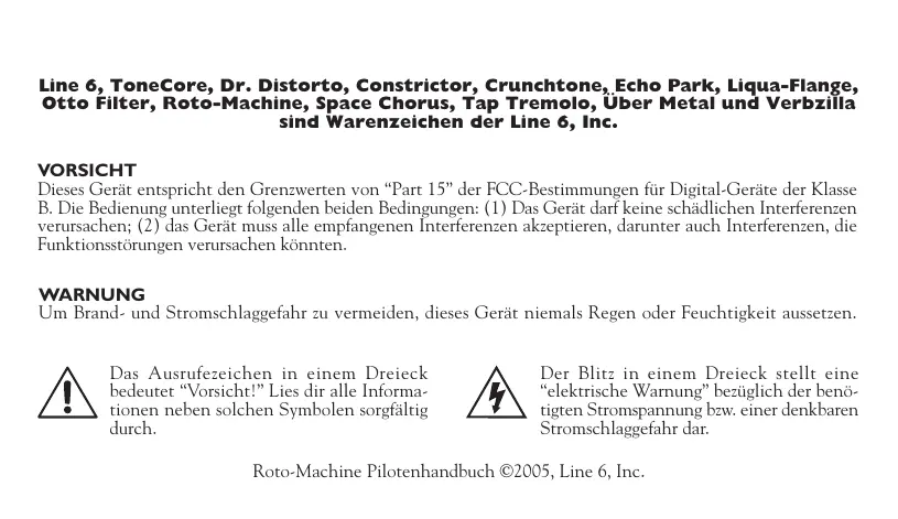 Line 6, ToneCore, Dr. Distorto, Constrictor, Crunchtone, Echo Park, Liqua-Flange, Otto Filter, Roto-Machine, Space Chorus, Tap Tremolo, Über Metal und Verbzilla sind Warenzeichen der Line 6, Inc. VORSICHT Dieses Gerät entspricht den Grenzwerten von “Part 15 der FCC-Bestimmungen für Digital-Geräte der Klasse B. Die Bedienung unterliegt folgenden beiden Bedingungen: (1) Das Gerät darf keine schädlichen Interferenzen verursachen: (2) das Gerät muss alle empfangenen Interferenzen akzeptieren, darunter auch Interferenzen, die Funktionsstrungen verursachen kännten. WARNUNG Um Brand- und Stromschlaggefahr zu vermeiden, dieses Gerät niemals Regen oder Feuchtigkeit aussetzen. Das Ausrufezeichen in einem Dreieck Der Blitz in einem Dreieck srellt eine A bedeuter “Vorsicht!” Lies dir alle Informa- A “elektrische Warnung” beztüglich der benë- tionen neben solchen Symbolen sorgfältig tigten Stromspannung bzw. einer denkbaren durch. Stromschlaggefahr dar. Roto-Machine Pilotenhandbuch ©2005, Line 6, Inc.