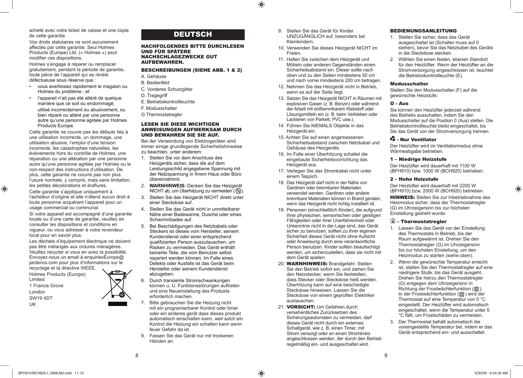 der Kontrolle durch Holmes, Reparaturen oder Änderungen durch Personen, die von Holmes nicht autorisiert wurden, oder Nichtbeachtung der Nutzungsanweisungen zurückzuführen sind, werden von dieser Garantie nicht abgedeckt. Außerdem sind durch normale Gebrauchsabnutzung entstandene Mängel, wie beispielsweise geringfügige Verfärbungen und Kratzer, von dieser Garantie ausgenommen. Die im Rahmen dieser Garantie eingeräumten Rechte gelten ausschließlich für den ursprünglichen Käufer und dürfen nicht auf die kommerzielle oder kommunale Nutzung ausgedehnt werden. Falls Ihr Gerät mit einer länderspezifischen Garantie- oder Gewährleistung geliefert wurde, sollten Sie sich nach deren Bedingungen und nicht nach dieser Garantie richten. Nötigenfalls kann Ihnen der örtliche Vertragshändler weitere Informationen geben. Elektrische Altgeräte dürfen nicht über den Hausmüll entsorgt werden. Geben Sie, falls möglich, diese Geräte bei geeigneten Rücknahmestellen ab. Wenn Sie weitere Informationen zur Rücknahme und Entsorgung von Elektrogeräten erhalten möchten, senden Sie bitte eine E-Mail an die Adresse enquiriesEurope@jardencs.com Holmes Products (Europe) Limited 1 Francis Grove London SW19 4DT Großbritannien