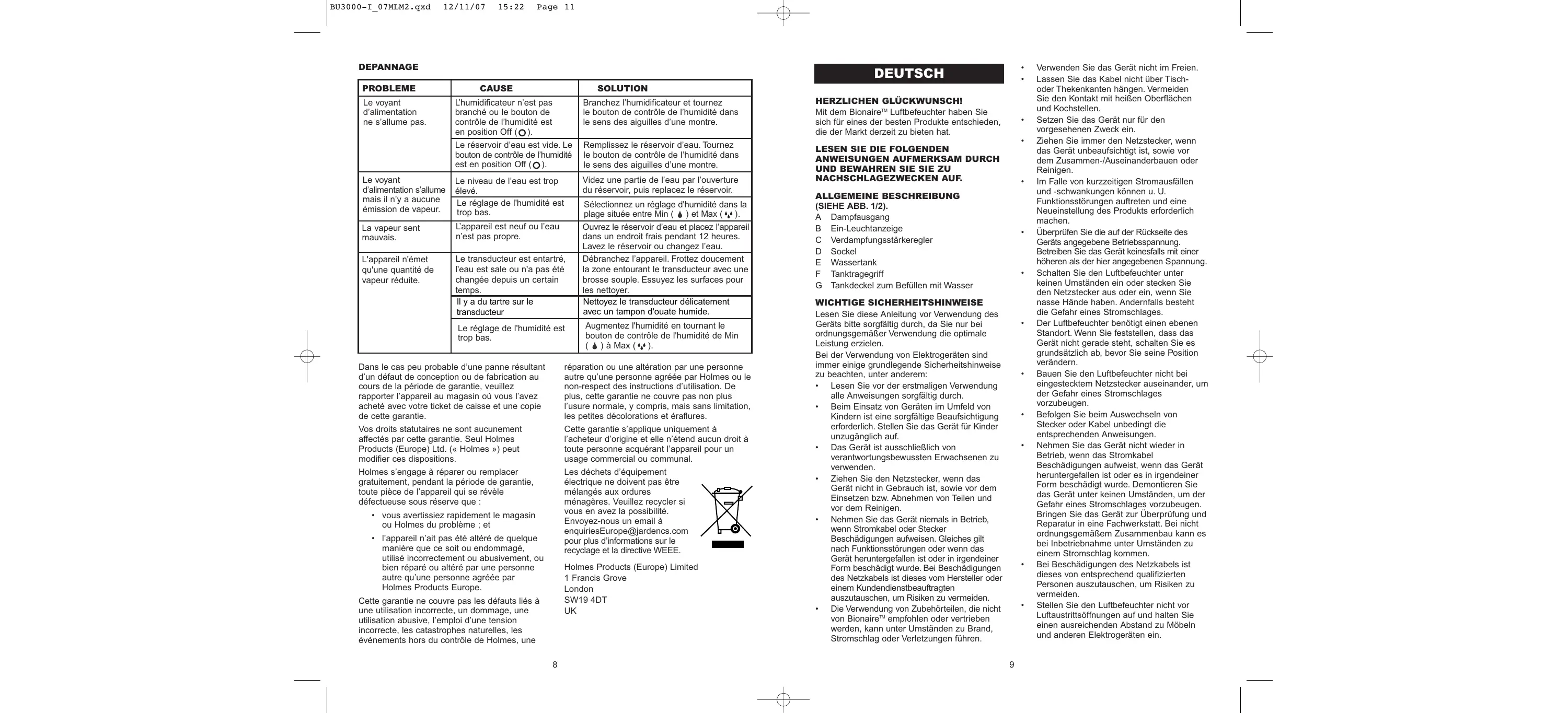 Sollte das Gerät entgegen aller Erwartungen innerhalb dieses Zeitraums aufgrund eines Konzeptions- oder Herstellungsfehlers nicht mehr einwandfrei funktionieren, können Sie es zusammen mit dem Kaufbeleg und einer Kopie dieses Garantiebelegs am Kaufort abgeben. Die aus dieser Garantie erwachsenden Ansprüche und Leistungen sind als Ergänzung zu Ihren gesetzlichen Ansprüchen anzusehen. Diese werden von dieser Garantie nicht beeinträchtigt. Diese Bedingungen können ausschließlich durch Holmes Products (Europe) Ltd. ("Holmes") geändert werden. Holmes verpflichtet sich innerhalb der Garantiedauer zur kostenlosen Reparatur oder zum kostenlosen Austausch des Geräts bzw. von Geräteteilen, die nachweislich nicht ordnungsgemäß funktionieren. Es gelten jedoch folgende Voraussetzungen: • Sie müssen den Händler oder Holmes unverzüglich über das Problem informieren. • An dem Gerät wurden keinerlei Änderungen vorgenommen, es wurde nur bestimmungsgemäß eingesetzt, nicht beschädigt und nicht von Personen repariert, die von Holmes nicht autorisiert wurden. Mängel, die auf unsachgemäße Nutzung, Beschädigung, nicht zugelassene elektrische Spannung, Naturgewalten, Ereignisse außerhalb der Kontrolle durch Holmes, Reparaturen oder Änderungen durch Personen, die von Holmes nicht autorisiert wurden, oder Nichtbeachtung der Nutzungsanweisungen zurückzuführen sind, werden von dieser Garantie nicht abgedeckt. Außerdem sind durch normale Gebrauchsabnutzung entstandene Mängel, wie beispielsweise geringfügige Verfärbungen und Kratzer, von dieser Garantie ausgenommen. Die im Rahmen dieser Garantie eingeräumten Rechte gelten ausschließlich für den ursprünglichen Käufer und dürfen nicht auf die kommerzielle oder kommunale Nutzung ausgedehnt werden. Elektrische Altgeräte dürfen nicht über den Hausmüll entsorgt werden. Geben Sie, falls möglich, diese Geräte bei geeigneten Rücknahmestellen ab. Wenn Sie weitere Informationen zur Rücknahme und Entsorgung von Elektrogeräten erhalten möchten, senden Sie bitte eine E-Mail an die Adresse enquiriesEurope@jardencs.com Holmes Products (Europe) Limited 1 Francis Grove London SW19 4DT Großbritannien