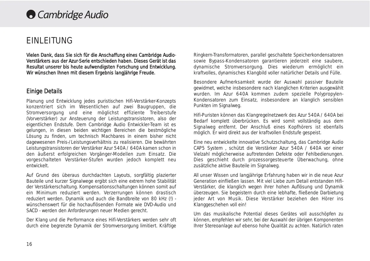 540A/640A HIFI-Verstärker INHALT wir zu den weiteren Komponenten unserer Cambridge Audio Azur-Line. Denn diese sind auf demselben hohen Niveau wie Ihr neuer Verstärker entwickelt worden.