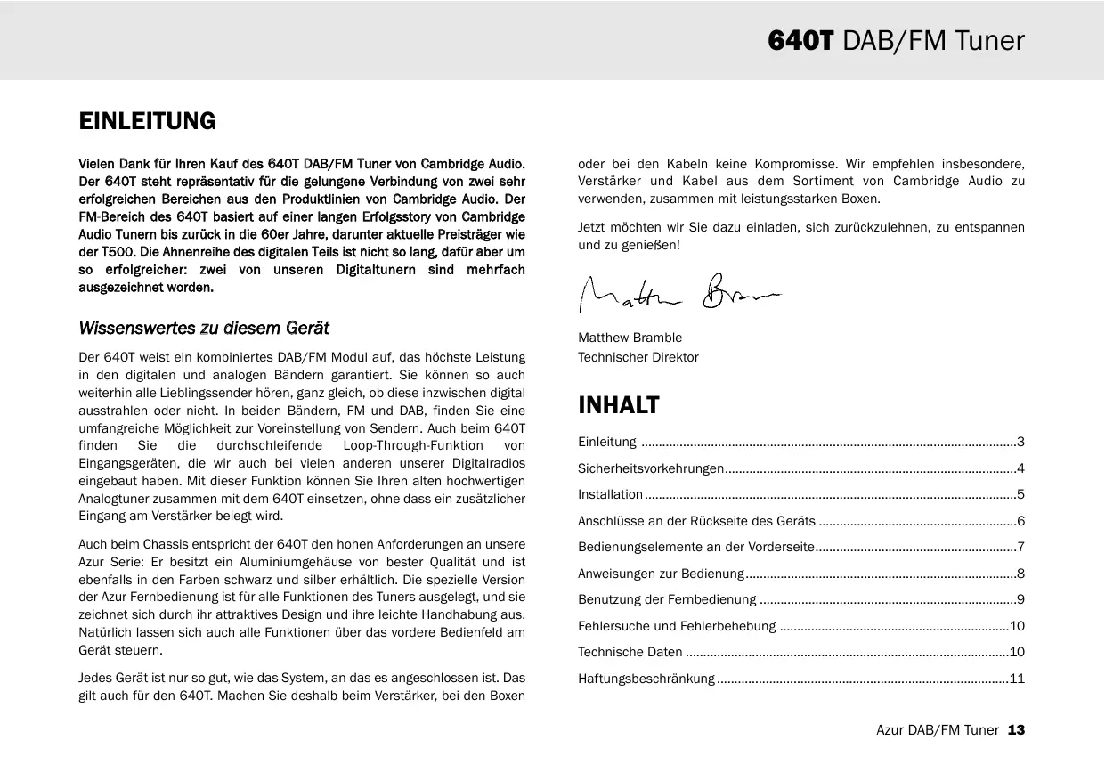 640T DAB/FM Tuner EINLEITUNG Vielen Dank für Ihren Kauf des 640T DAB/FM Tuner von Cambridge Audio. Der 640T steht repräsentativ für die gelungene Verbindung von zwei sehr erfolgreichen Bereichen aus den Produktlinien von Cambridge Audio. Der FM-B Bereich des 640T basiert auf einer langen Erfolgsstory von Cambridge Audio Tunern bis zurück in die 60er Jahre, darunter aktuelle Preisträger wie der T500. Die Ahnenreihe des digitalen Teils ist nicht so lang, dafür aber um so erfolgreicher: zwei von unseren Digitaltunern sind mehrfach ausgezeichnet worden.