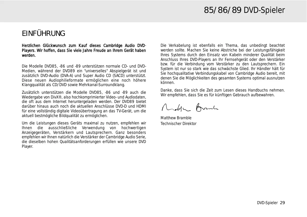 Die Verkabelung ist ebenfalls ein Thema, das unbedingt beachtet werden sollte. Machen Sie keine Abstriche bei der Leistungsfähigkeit Ihres Systems durch den Einsatz von Kabeln minderer Qualität beim Anschluss Ihres DVD-Players an Ihr Fernsehgerät oder den Verstärker bzw. für die Verbindung vom Verstärker zu den Lautsprechern. Ein System ist nur so stark wie das schwächste Glied. Ihr Händler hält für Sie hochqualitative Verbindungskabel von Cambridge Audio bereit, mit denen Sie die Möglichkeiten des gesamten Systems optimal ausnutzen können. Danke, dass Sie sich die Zeit zum Lesen dieses Handbuchs nehmen. Wir empfehlen, dass Sie es für künftigen Gebrauch aufbewahren.