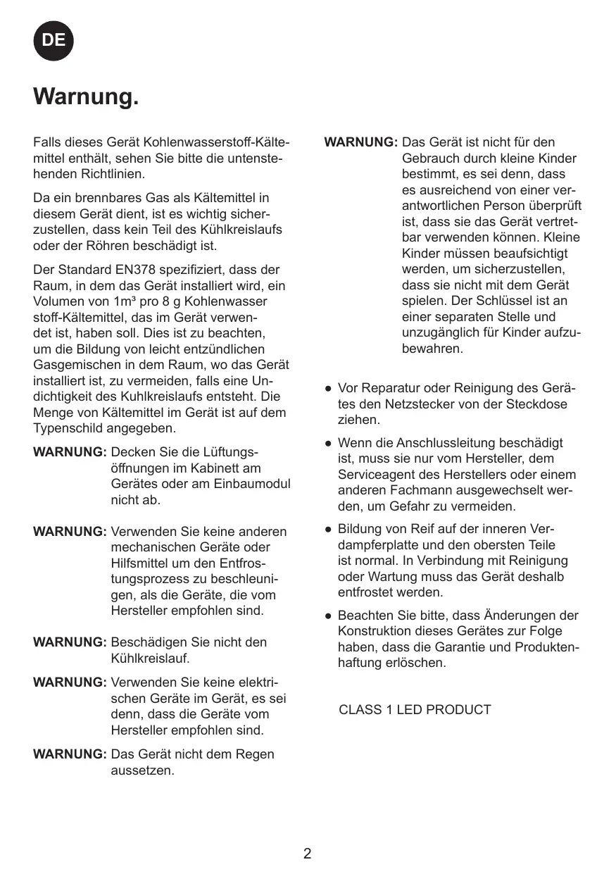 Falls dieses Gerät Kohlenwasserstoff-Kältemittel enthält, sehen Sie bitte die untenstehenden Richtlinien. Da ein brennbares Gas als Kältemittel in diesem Gerät dient, ist es wichtig sicherzustellen, dass kein Teil des Kühlkreislaufs oder der Röhren beschädigt ist. Der Standard EN378 spezifiziert, dass der Raum, in dem das Gerät installiert wird, ein Volumen von 1m³ pro 8 g Kohlenwasser stoff-Kältemittel, das im Gerät verwendet ist, haben soll. Dies ist zu beachten, um die Bildung von leicht entzündlichen Gasgemischen in dem Raum, wo das Gerät installiert ist, zu vermeiden, falls eine Undichtigkeit des Kuhlkreislaufs entsteht. Die Menge von Kältemittel im Gerät ist auf dem Typenschild angegeben.
