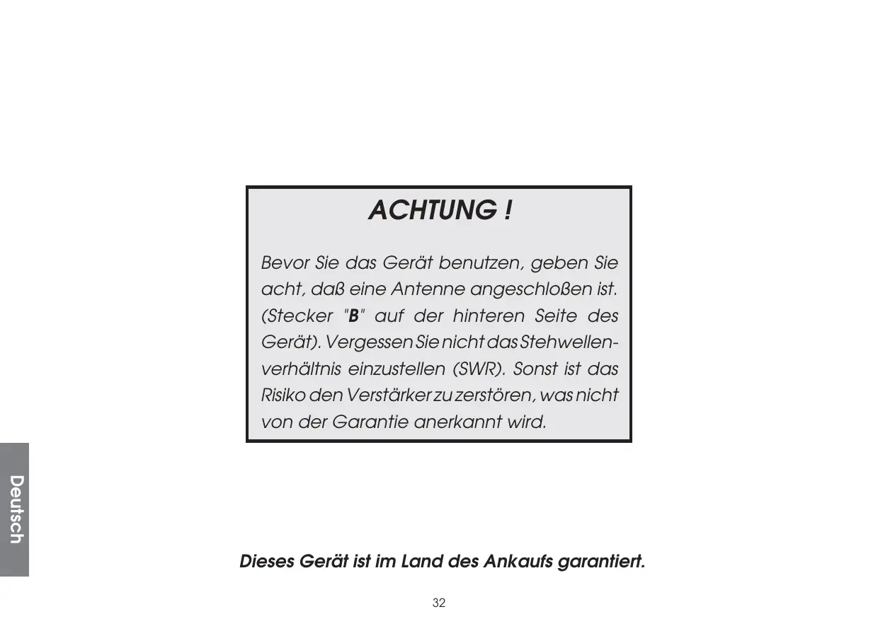 ACHTUNG ! Bevor Sie das Gerät benutzen, geben Sie acht, daß eine Antenne angeschloßen ist. (Stecker "B" auf der hinteren Seite des Gerät). Vergessen Sie nicht das Stehwellenverhältnis einzustellen (SWR). Sonst ist das Risiko den Verstärker zu zerstören, was nicht von der Garantie anerkannt wird. Deutsch Dieses Gerät ist im Land des Ankaufs garantiert.