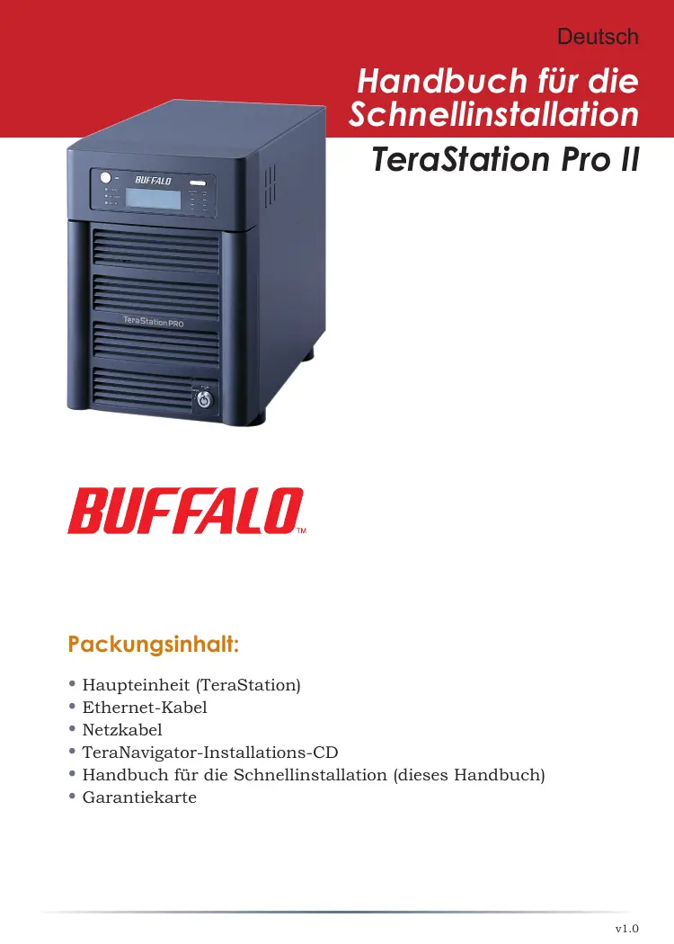 TeraStation Pro II Packungsinhalt: • Haupteinheit (TeraStation) • Ethernet-Kabel • Netzkabel • TeraNavigator-Installations-CD • Handbuch für die Schnellinstallation (dieses Handbuch) • Garantiekarte
