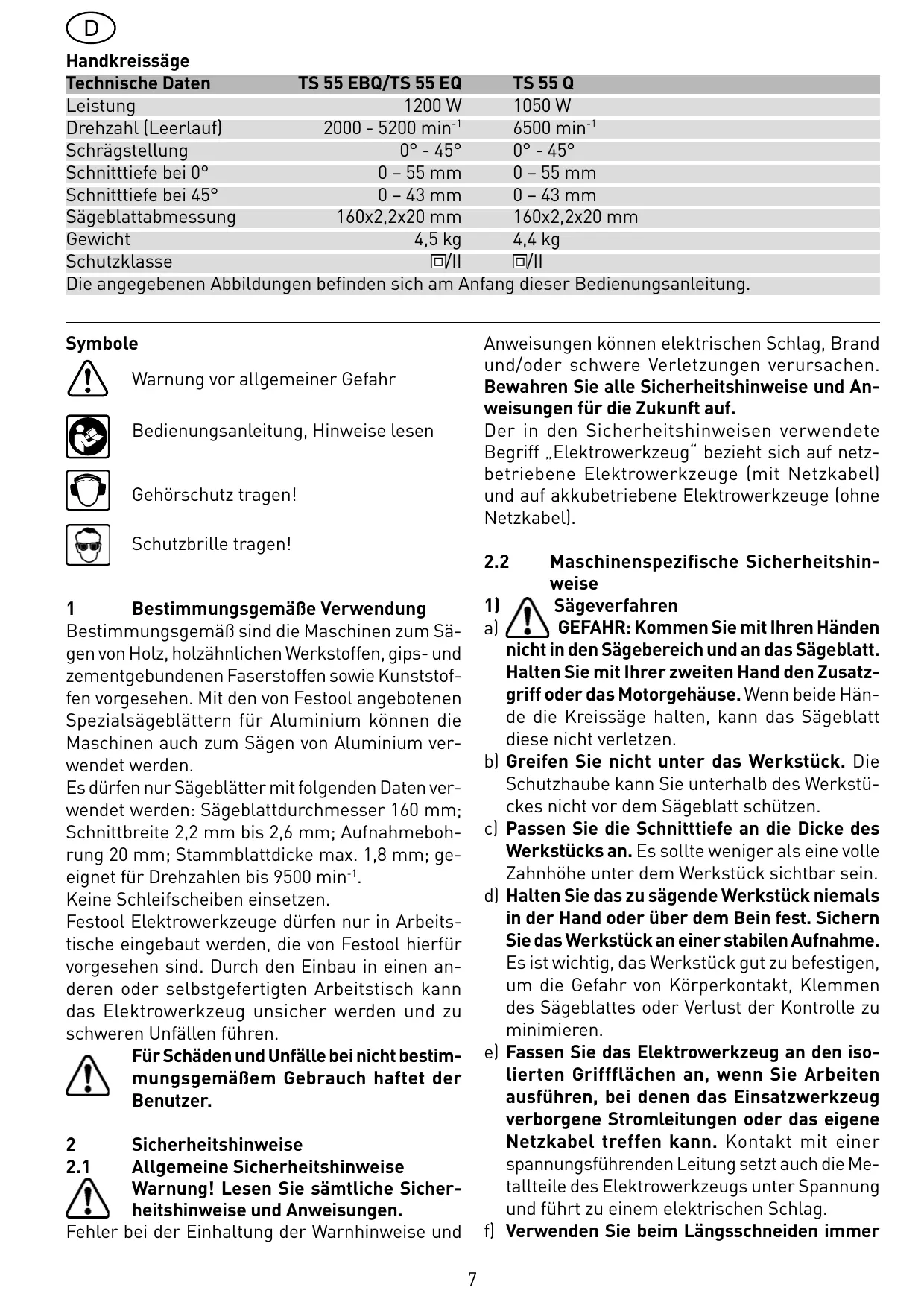 TS 55 Q Leistung 1200 W 1050 W Drehzahl (Leerlauf) 2000 - 5200 min-1 6500 min-1 Schrägstellung 0° - 45° 0° - 45° Schnitttiefe bei 0° 0 – 55 mm 0 – 55 mm Schnitttiefe bei 45° 0 – 43 mm 0 – 43 mm Sägeblattabmessung 160x2,2x20 mm 160x2,2x20 mm Gewicht 4,5 kg 4,4 kg Schutzklasse /II /II Die angegebenen Abbildungen befinden sich am Anfang dieser Bedienungsanleitung. Symbole Anweisungen können elektrischen Schlag, Brand und/oder schwere Verletzungen verursachen. Bewahren Sie alle Sicherheitshinweise und Anweisungen für die Zukunft auf. Der in den Sicherheitshinweisen verwendete Begriff „Elektrowerkzeug“ bezieht sich auf netzbetriebene Elektrowerkzeuge (mit Netzkabel) und auf akkubetriebene Elektrowerkzeuge (ohne Netzkabel). Warnung vor allgemeiner Gefahr Bedienungsanleitung, Hinweise lesen Gehörschutz tragen! Schutzbrille tragen!