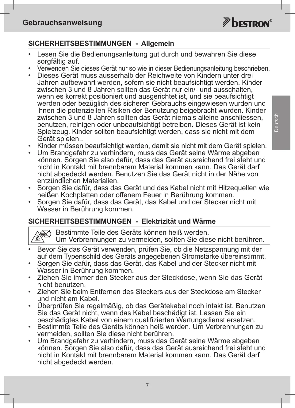 10. Um Garantieleistungen in Anspruch zu nehmen, wenden Sie sicht direkt an Ihren Händler. Bestron bietet