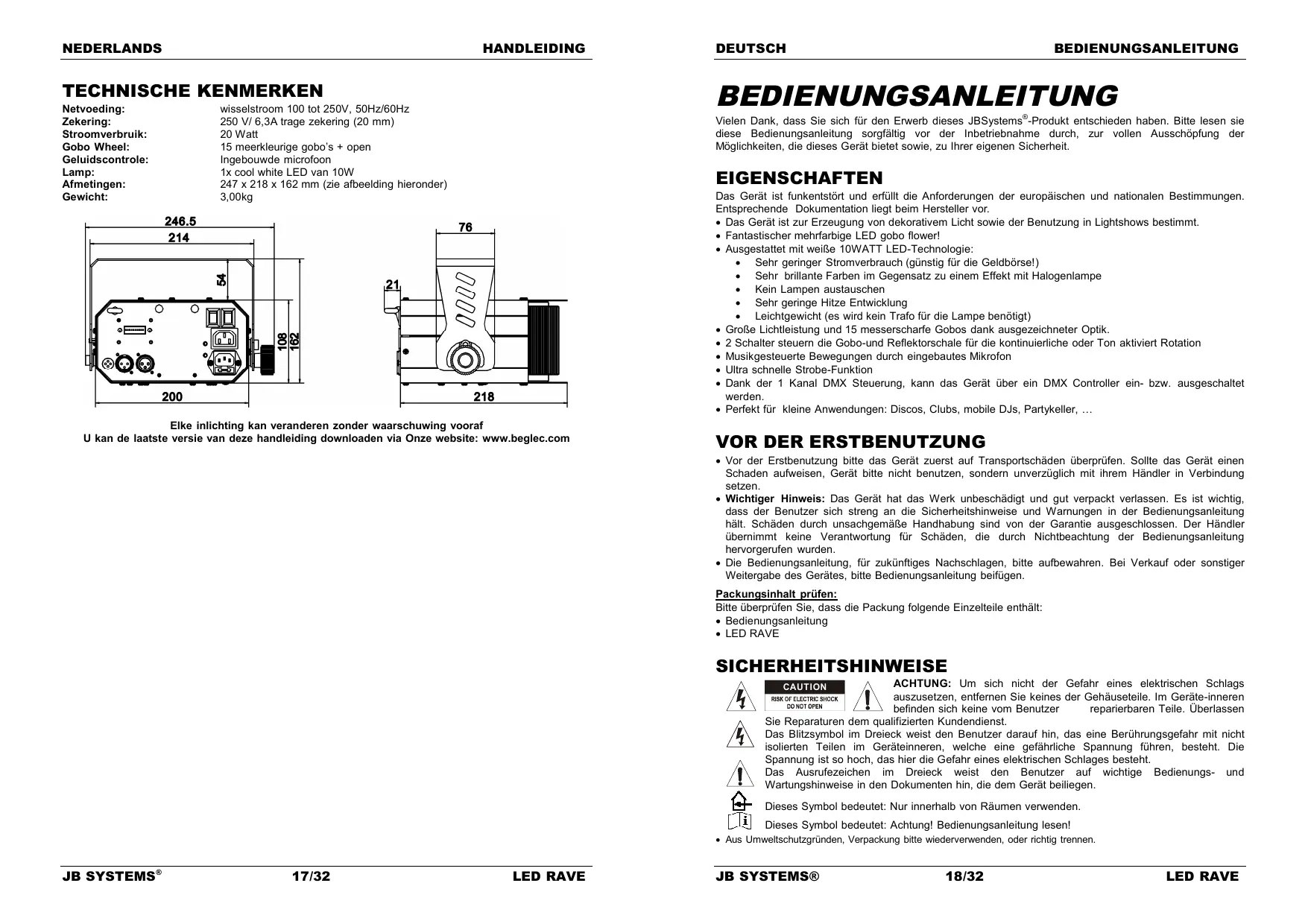 Finden Sie kostenlos die Bedienungsanleitung des Geräts LED RAVE JBSYSTEMS als PDF.