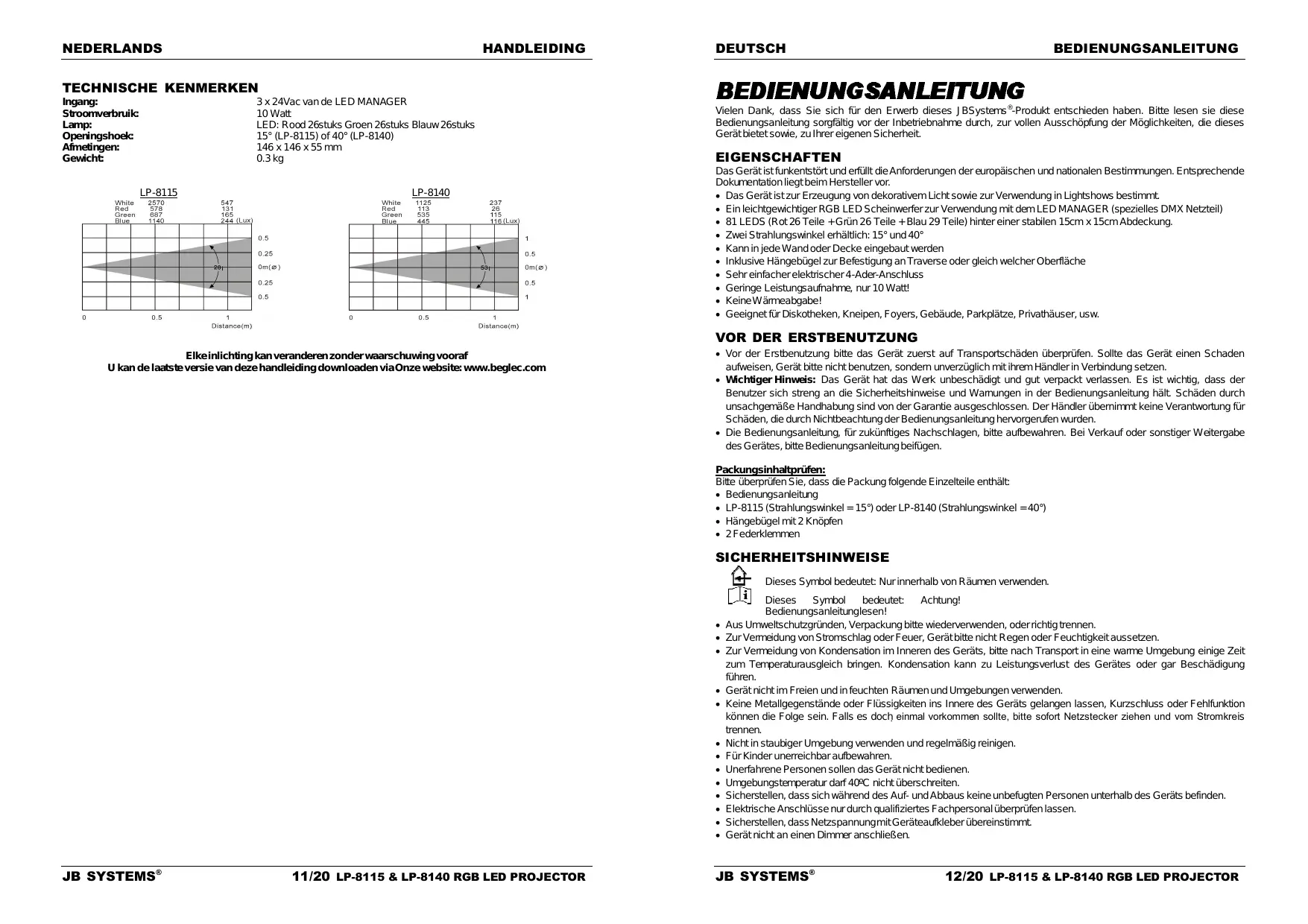 Elke inlichting kan veranderen zonder waarschuwing vooraf U kan de laatste versie van deze handleiding downloaden via Onze website: www.beglec.com Vor der Erstbenutzung bitte das Gerät zuerst auf Transportschäden überprüfen. Sollte das Gerät einen Schaden aufweisen, Gerät bitte nicht benutzen, sondern unverzüglich mit ihrem Händler in Verbindung setzen. Wichtiger Hinweis: Das Gerät hat das Werk unbeschädigt und gut verpackt verlassen. Es ist wichtig, dass der Benutzer sich streng an die Sicherheitshinweise und Warnungen in der Bedienungsanleitung hält. Schäden durch unsachgemäße Handhabung sind von der Garantie ausgeschlossen. Der Händler übernimmt keine Verantwortung für Schäden, die durch Nichtbeachtung der Bedienungsanleitung hervorgerufen wurden. Die Bedienungsanleitung, für zukünftiges Nachschlagen, bitte aufbewahren. Bei Verkauf oder sonstiger Weitergabe des Gerätes, bitte Bedienungsanleitung beifügen. Packungsinhaltprüfen: Bitte überprüfen Sie, dass die Packung folgende Einzelteile enthält: Bedienungsanleitung LP-8115 (Strahlungswinkel = 15°) oder LP-8140 (Strahlungswinkel = 40°) Hängebügel mit 2 Knöpfen 2 Federklemmen SICHERHEITSHINWEISE Dieses Symbol bedeutet: Nur innerhalb von Räumen verwenden.