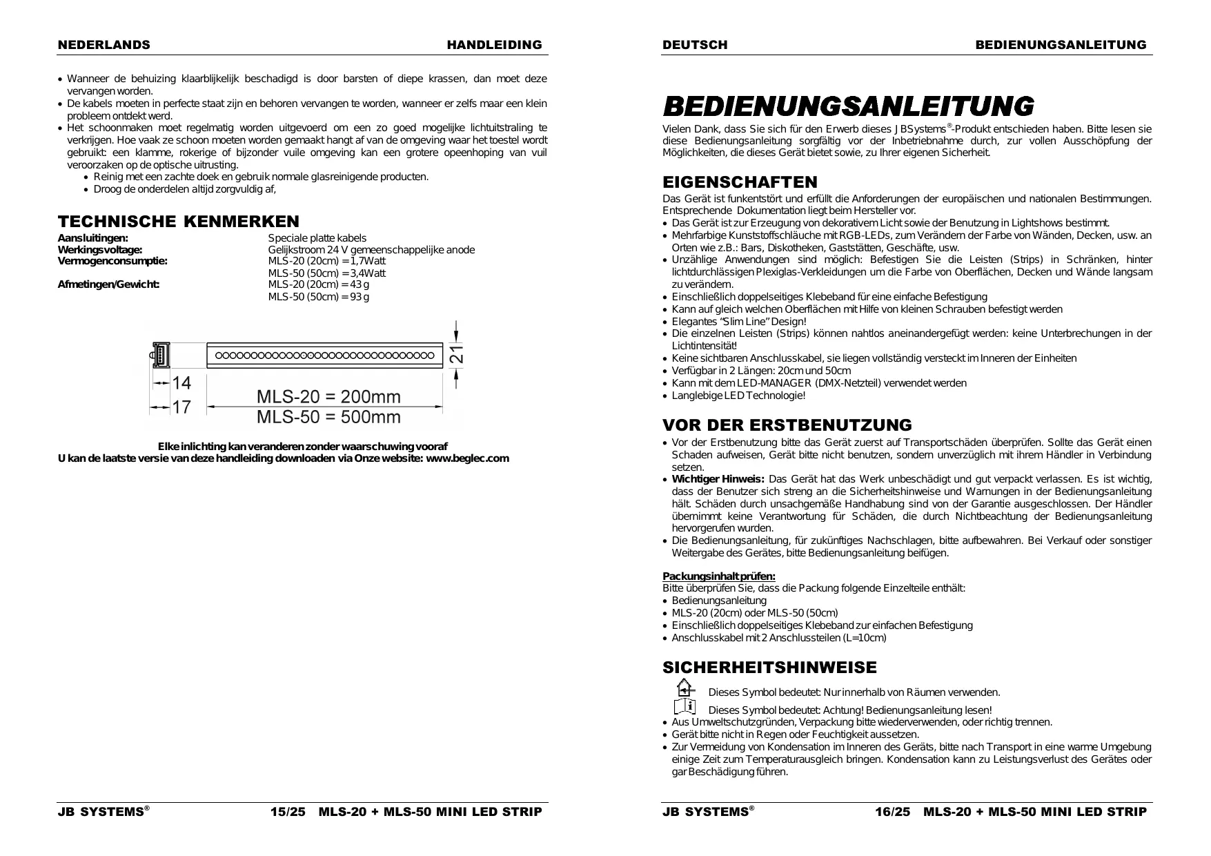 Elke inlichting kan veranderen zonder waarschuwing vooraf U kan de laatste versie van deze handleiding downloaden via Onze website: www.beglec.com Vor der Erstbenutzung bitte das Gerät zuerst auf Transportschäden überprüfen. Sollte das Gerät einen Schaden aufweisen, Gerät bitte nicht benutzen, sondern unverzüglich mit ihrem Händler in Verbindung setzen. Wichtiger Hinweis: Das Gerät hat das Werk unbeschädigt und gut verpackt verlassen. Es ist wichtig, dass der Benutzer sich streng an die Sicherheitshinweise und Warnungen in der Bedienungsanleitung hält. Schäden durch unsachgemäße Handhabung sind von der Garantie ausgeschlossen. Der Händler übernimmt keine Verantwortung für Schäden, die durch Nichtbeachtung der Bedienungsanleitung hervorgerufen wurden. Die Bedienungsanleitung, für zukünftiges Nachschlagen, bitte aufbewahren. Bei Verkauf oder sonstiger Weitergabe des Gerätes, bitte Bedienungsanleitung beifügen. Packungsinhalt prüfen: Bitte überprüfen Sie, dass die Packung folgende Einzelteile enthält: Bedienungsanleitung MLS-20 (20cm) oder MLS-50 (50cm) Einschließlich doppelseitiges Klebeband zur einfachen Befestigung Anschlusskabel mit 2 Anschlussteilen (L=10cm) SICHERHEITSHINWEISE Dieses Symbol bedeutet: Nur innerhalb von Räumen verwenden. Dieses Symbol bedeutet: Achtung! Bedienungsanleitung lesen! Aus Umweltschutzgründen, Verpackung bitte wiederverwenden, oder richtig trennen. Gerät bitte nicht in Regen oder Feuchtigkeit aussetzen. Zur Vermeidung von Kondensation im Inneren des Geräts, bitte nach Transport in eine warme Umgebung einige Zeit zum Temperaturausgleich bringen. Kondensation kann zu Leistungsverlust des Gerätes oder gar Beschädigung führen. JB SYSTEMS® 15/25