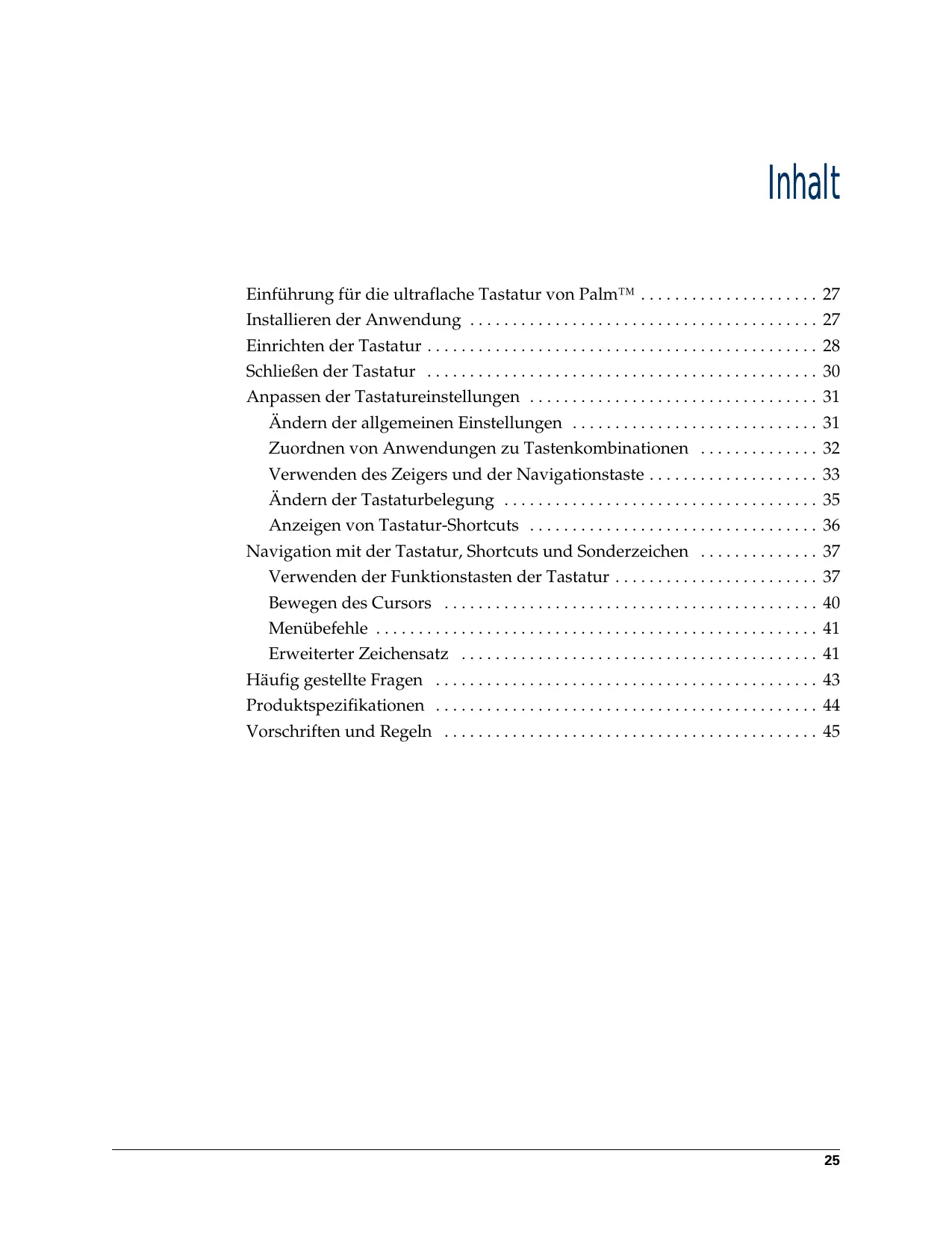 - Inhalt Einführung für die ultraflache Tastatur von Palm™ p. 27