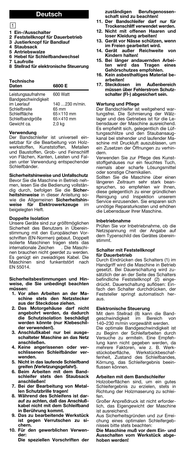 Ein-/Ausschalter Feststellknopf für Dauerbetrieb Justierknopf für Bandlauf Staubsack Antriebswalze Hebel für Schleifbandwechsel Laufrolle Stellrad für elektronische Steuerung Technische Daten Leistungsaufnahme Bandgeschwindigkeit im Leerlauf Schleifbreite Schleiffläche Schleifbandgröße Gewicht ca. 6800 E 600 Watt 140 …230 m/min. 65 mm 65110 mm 65410 mm 2,0 kg Verwendung Der Bandschleifer ist universell einsetzbar für die Bearbeitung von Holzwerkstoffen, Kunststoffen, Metallen und Baustoffen, Grob- und Feinschliff von Flächen, Kanten, Leisten und Falzen unter Verwendung entspechender Schleifbänder. Sicherheitshinweise und Unfallschutz Bevor Sie die Maschine in Betrieb nehmen, lesen Sie die Bedienung vollständig durch, befolgen Sie die Sicherheitshinweise in dieser Anleitung sowie die Allgemeinen Sicherheitshinweise für Elektrowerkzeuge im beigelegten Heft. Doppelte Isolation Unsere Geräte sind zur größtmöglichen Sicherheit des Benutzers in Übereinstimmung mit den Europäischen Vorschriften (EN-Normen) gebaut. Doppelt isolierte Maschinen tragen stets das internationale Zeichen . Die Maschinen brauchen nicht geerdet zu werden. Es genügt ein zweiadriges Kabel. Die Maschinen sind funkentstört nach EN 55014. Sicherheitsbestimmungen und Hinweise, die Sie unbedingt beachten müssen: