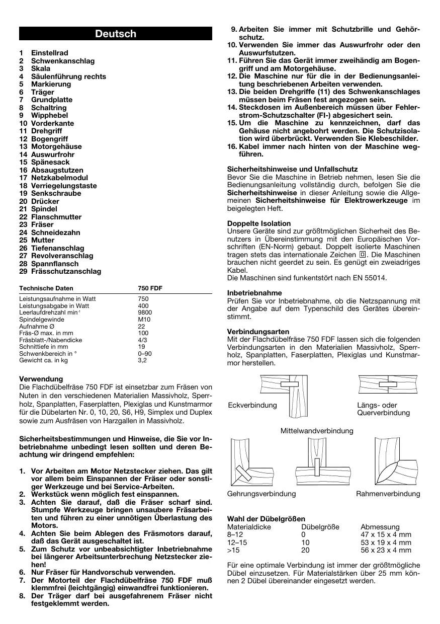 4/3 0–90 3,2 Verwendung Die Flachdübelfräse 750 FDF ist einsetzbar zum Fräsen von Nuten in den verschiedenen Materialien Massivholz, Sperrholz, Spanplatten, Faserplatten, Plexiglas und Kunstmarmor für die Dübelarten Nr. 0, 10, 20, S6, H9, Simplex und Duplex sowie zum Ausfräsen von Harzgallen in Massivholz. Inbetriebnahme Prüfen Sie vor Inbetriebnahme, ob die Netzspannung mit der Angabe auf dem Typenschild des Gerätes übereinstimmt. Verbindungsarten Mit der Flachdübelfräse 750 FDF lassen sich die folgenden Verbindungsarten in den Materialien Massivholz, Sperrholz, Spanplatten, Faserplatten, Plexiglas und Kunstmarmor herstellen. Eckverbindung Längs- oder Querverbindung Mittelwandverbindung Sicherheitsbestimmungen und Hinweise, die Sie vor Inbetriebnahme unbedingt lesen sollten und deren Beachtung wir dringend empfehlen: