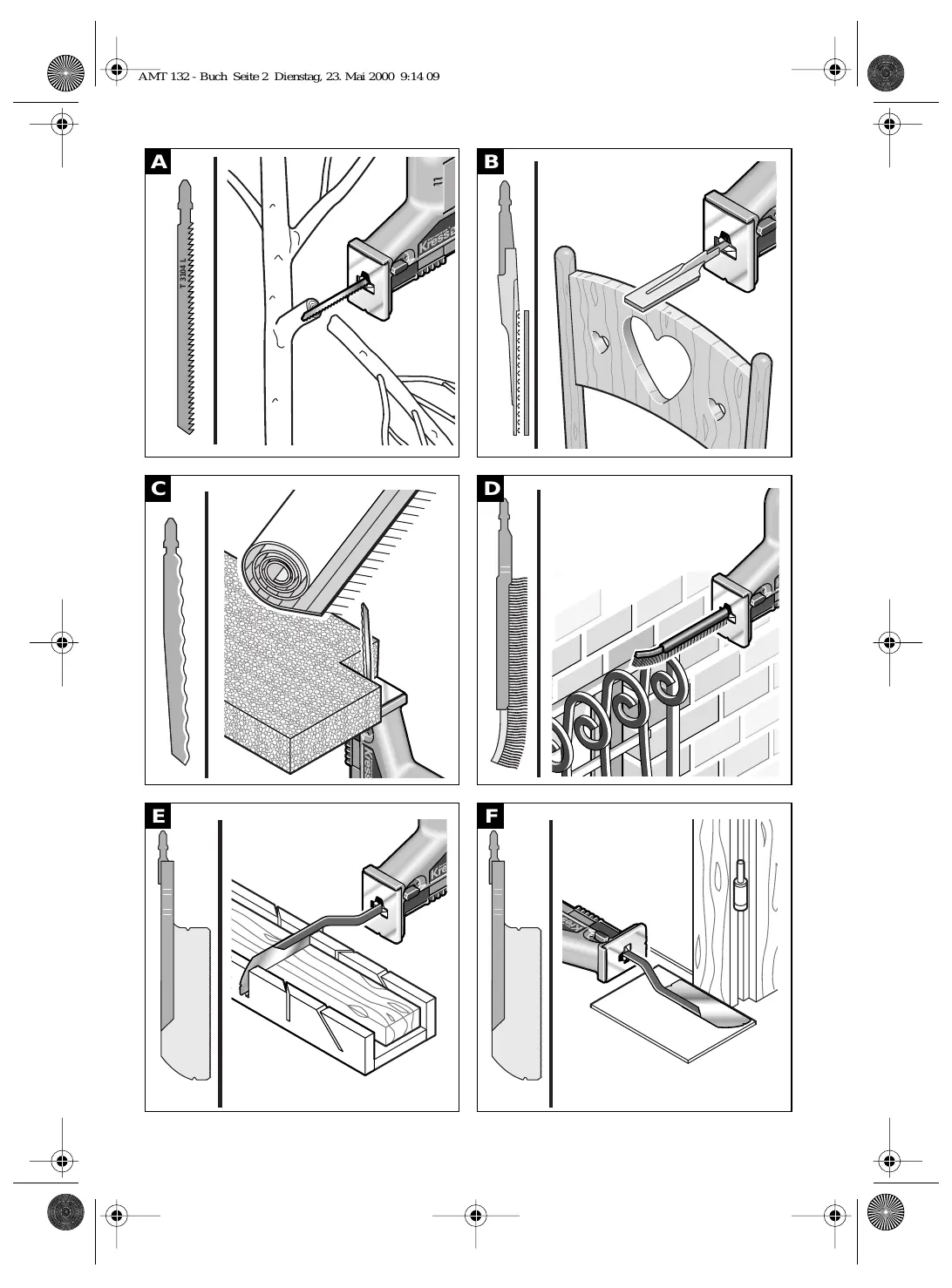 Verwendung Das Akku-Multi-Talent ist geeignet zum Sägen, Schleifen und Bürsten von Holz, Kunststoff, Metall und Baustoffen. Es ist für gerade und kurvige Schnitte geeignet und trennt flächenbündig ab (siehe Abbildungen A – F).