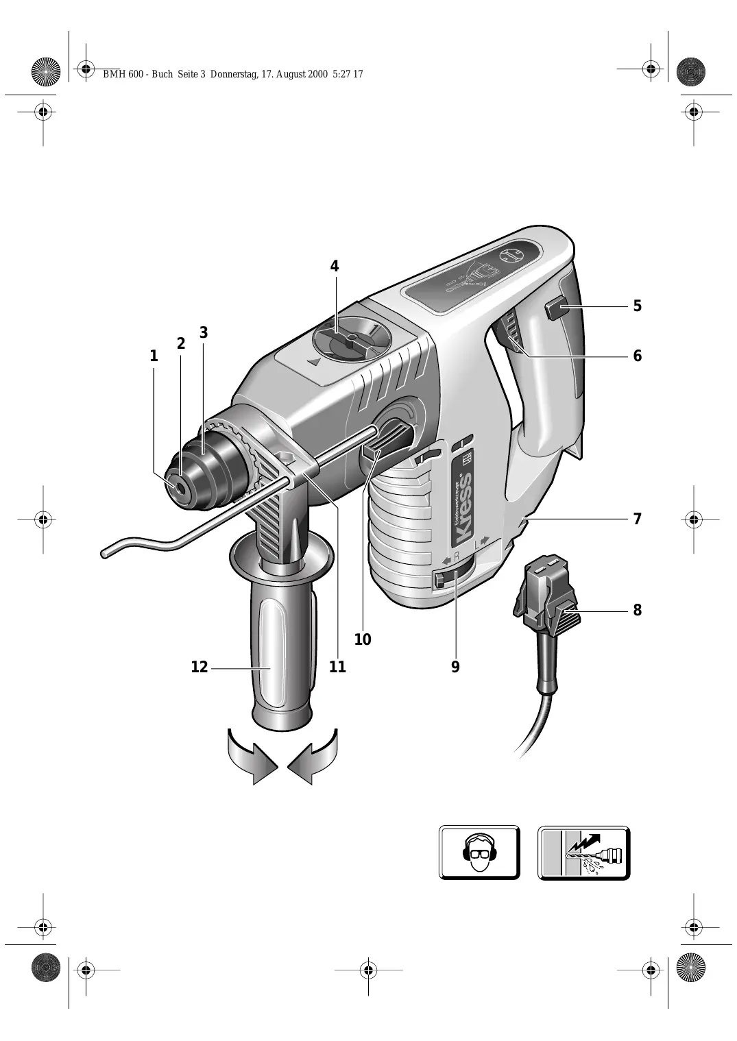 Bevor Sie die Maschine in Betrieb nehmen, lesen Sie die Bedienungsanleitung vollständig durch, befolgen Sie die Sicherheitshinweise in dieser Anleitung sowie die Allgemeinen Sicherheitshinweise für Elektrowerkzeuge im beigelegten Heft. Wird das Netzkabel während der Arbeit beschädigt, sofort Netzstecker ziehen. Niemals mit beschädigtem Netzkabel arbeiten. Schutzbrille, Gehörschutz, Schutzhandschuhe und festes Schuhwerk tragen. Aus Sicherheitsgründen nur mit montiertem Zusatzgriff 12 arbeiten. Kein asbesthaltiges Material bearbeiten. Gerät nicht am Kabel tragen. Steckdosen im Außenbereich müssen über Fehlerstromschutzschalter (FI-) abgesichert sein. Um die Maschine zu kennzeichnen, darf das Gehäuse nicht angebohrt werden. Die Schutzisolation wird überbrückt. Verwenden Sie Klebeschilder. Wenn der Bohrer unerwartet festklemmt, reagiert die Maschine ruckartig. Nehmen Sie deshalb immer einen sicheren Stand ein und halten Sie die Maschine fest mit beiden Händen.