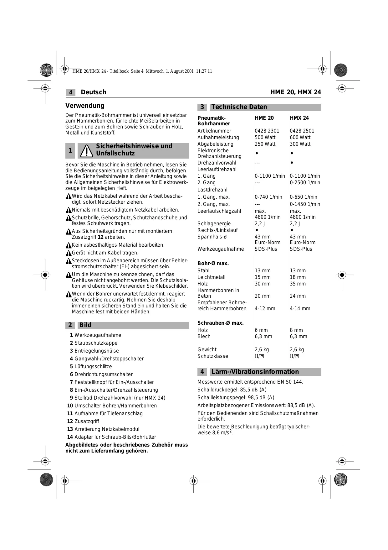 4 A 7 HME 20/HMX 24 - Titel.book Seite 4 Mittwoch, 1. August 2001 11:27 11 / e æ&) & SP 4 Deutsch HME 20, HMX 24 | Verwendung 3 Technische Daten Der Pneumatik-Bohrhammer ist universel einsetzbar s zum Hammerbohren, für leichte MeiRelarbeiten in preumatle HME 20 |HMX24 Gestein und zum Bohren sowie Schrauben in Holz, Metall und Kunststoff. Artkelnummer 04282301 |0428 2501 Aufnahmeleistung 500 Watt |600 Watt Sicherheitshinweise und Abgabeleistung 250 Watt |300 Watt 1 IN Elektronische Unfallschutz Drehzahisteuerung | * , Bevor Sie die Maschine in Betrieb nehmen, lesen Sie Drehzahivorwahl — . die Bedienungsanleitung vollständig durch, befolgen Leerlaufdrehzahl Sie die Sicherheitshinweise in dieser Anleitung sowie 1. Gang 0-1100 1/min |0-1100 1/min die Allgemeinen Sicherheitshinweise für Elektrowerk- 2. Gang _ 0-2500 1/min zeuge im beigelegten Heft. Lastdrehzahl Aird das Netzkabel während der Arbeit beschä- 1. Gang, max. 0-740 1/min |0-650 1/min digt, sofort Netzstecker ziehen. 2. Gang, max . 0-1450 1/min Aiemals mit beschädigtem Netzkabel arbeiten. Leerlaufschlagzahl | max. max. Aschutbrille, Gehërschutz, Schutzhandschuhe und 4800 1/min | 4800 1/min estes Schuhwerk tragen: Schlagenergie 22] 22] AAus Sicherheitsgründen nur mit montiertem Rechts-/Linkslauf . . Zusatzgriff 12 arbeiten. Spannhals-9 43 mm 43 mm AKein asbesthaltiges Material bearbeiten. Euro-Norm | Euro-Norm A Gerit riche am Kabel tagen Werkzeugaufnahme |SDS-Plus |SDS-Plus ASteckdosen im AuBenbereich müssen über Fehler- _ stromschutzschalter (FI-) abgesichert sein. sonre max. 15 mm me | PS ï PS oO) AUM die Maschine zu kennzeichnen, darf das L'eichtmetall 15 mm 18 mm @ Gehäuse nicht angebohrt werden. Die S chutzisola- ; tion wird überbrückt. Verwenden Sie Klebeschilder. Ho E nerboh 30 mm 35 mm Aenn der Bohrer unerwartet festklemmt, reagiert Bain" |29 mm 24 mm die Maschine ruckartig. Nehmen Sie deshalb Empfohlener Bohrbe- inmer einen sicheren "Stand ein und halten Sie die Keich Hammerbohren |412mm |4-14mm 2 Bild Schrauben-2 max. Holz 6mm 8mm 1 Werkzeugaufnahme Blech 6,3 mm 6,3 mm 2 Staubschutzkappe 3 Entriegelungshülse Gewicht 2,6 kg 2,6 kg 4 Gangwahl-Drehstoppschalter Schutzkiasse 1e Del 5 Lüftungsschlitze . re : 6 Drehrichtungsumschalter 4. Lärm-Wibrationsinformation 7 Feststellknopf für Ein-/Ausschalter Messwerte ermittelt entsprechend EN 50 144. 8 Ein-/Ausschalter/Drehzahisteuerung Schalldruckpegel: 85,5 dB (A) 9 Stellrad Drehzahivorwahl (nur HMX 24) Schallleistungspegel: 98,5 dB (A) 10 Umschalter Bohren/Hammerbohren Arbeitsplatzbezogener Emissionswert: 88,5 dB (A). 11 Aufnahme für Tiefenanschla Für den Bedienenden sind Schallschutzmanahmen 12 Zusatzgrif erforderlich. 13 Arretierung Netzkabelmodul Die beuertete Beschleunigung eträgt ypischer- 14 Adapter für Schraub-Bits/Bohrfutter . Abgebildetes oder beschriebenes Zubehôr muss nicht zum Lieferumfang gehôren.
