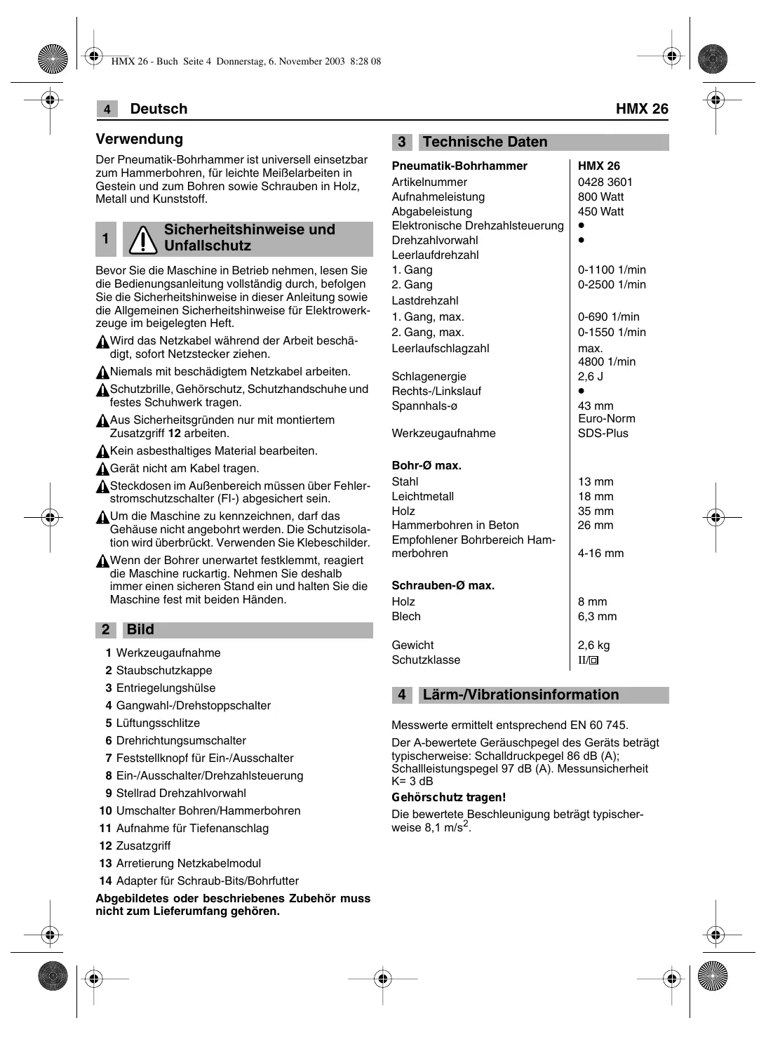 HMX 26 - Buch Seite 4 Donnerstag, 6. November 2003 8:28 08 4 Deutsch HMX 26 Verwendung 3 Technische Daten Der Pneumatik-Bohrhammer ist universel einsetzbar bneumatik-Bohrhammer HMX 26 zum Hammerbohren, für leichte MeiBelarbeiten in ‘ Gestein und zum Bohren sowie Schrauben in Holz, … Artikelnummer 0428 3601 Metall und Kunststoff. Aufnahmeleistung 800 Watt Abgabeleistung 450 Watt Sicherhetshinweiselund Elektronische Drehzahisteuerung | + 1 Drehzahivonwahl . nfallschutz OHETsE Leerlaufdrehzahl Bevor Sie die Maschine in Betrieb nehmen, lesen Sie 1. Gang 0-1100 4/min die Bedienungsanleitung vollständig durch, befolgen 2. Gang 0-2500 4/min Se de Siherelehinneles in dieser Anicitung some Lastdrehzahl ie Allgemeinen Sicherheitshinweise für Elektrowerk- , : zeuge im beigelegten Heft. j gen max. ù AH . Gang, max. - min AWird das Netzkabel während der Arbeit beschä- Loerl r Hagzaht digt, sofort Netzstecker ziehen. eerlaufschlagzai 2800 {min ANiemals mit beschädigtem Netzkabel arbeiten. Schlagenergie 261 ASchutzbrille, Gehôrschutz, Schutzhandschuhe und Rechts-/Linkslauf . festes Schuhwerk tragen. Spannhals- 43 mm AAus Sicherheitsgründen nur mit montiertem Euro-Norm Zusatzgriff 12 arbeiten. Werkzeugaufnahme SDS-Plus ÂKein asbesthaltiges Material bearbeiten. À Gerät nicht am Kabel tragen. Bohr-5 max. ASteckdosen im AuBenbereich müssen über Fehler- Stahl 18 mm stromschutzschalter (FI-) abgesichert sein. Leichtmetall 18 mm AU die Maschine zu kennzeichnen, darf das Holz 35 mm Gehäuse nicht angebohrt werden. Die Schutzisola- Hammerbohren in Beton 26 mm tion wird überbrückt. Verwenden Sie Klebeschilder. Empfohlener Bohrbereich Ham- AWenn der Bohrer unerwartet festklemmt, reagiert … "9"Pohren 4-16 mm die Maschine ruckartig. Nehmen Sie deshalb immer einen sicheren Stand ein und halten Sie die Schrauben-Q max. Maschine fest mit beiden Händen. Holz 8 mm Blech 6,3 mm 2 Bild Gewicht 2,6kg 1 Werkzeugaufnahme Schutzklasse 1 2 Staubschutzkappe 3 Entregelungshülse 4 Gangwahl-/Drehstoppschalter 5 Lüftungsschlitze 6 Drehrichtungsumschalter 7 Feststellknopf für Ein-/Ausschalter 8 Ein-/Ausschalter/Drehzahisteuerung 9 Stellrad Drehzahivorwahl 10 Umschalter Bohren/Hammerbohren 11 Aufnahme für Tiefenanschlag 12 Zusatzgriff 13 Arretierung Netzkabelmodul 14 Adapter für Schraub-Bits/Bohrfutter Abgebildetes oder beschriebenes Zubehôr muss nicht zum Lieferumfang gehôren. 4 Lärm-/Vibrationsinformation Messwerte ermittelt entsprechend EN 60 745. Der A-bewertete Geräuschpegel des Geräts beträgt typischerweise: Schalldruckpegel 86 dB (A); Schallleistungspegel 97 dB (A). Messunsicherheit K=3 dB Gehôrschutz tragen! Die bewertete Beschleunigung beträgt typischer- weise 8,1 m/s?.