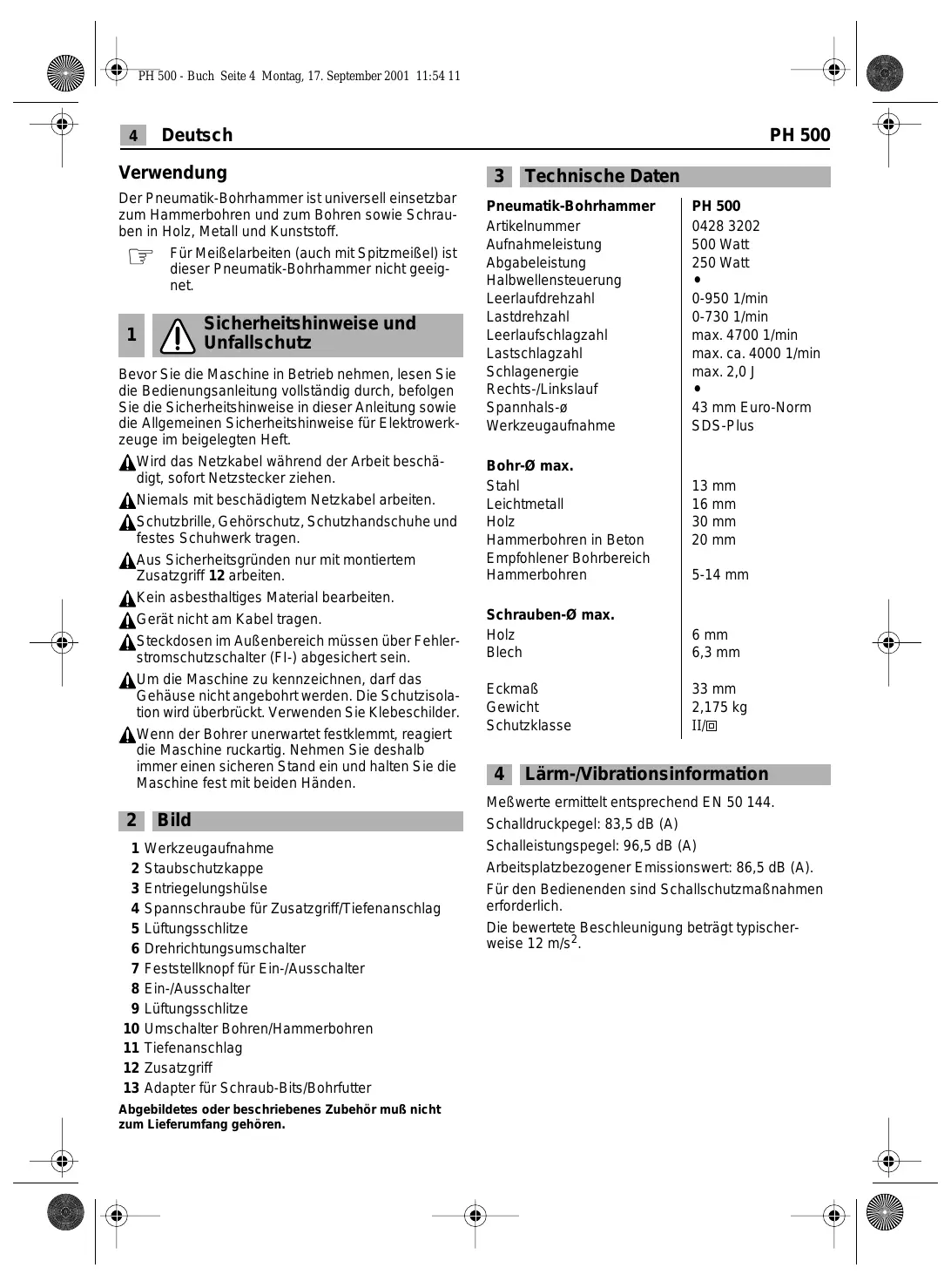 Lärm-/Vibrationsinformation Meßwerte ermittelt entsprechend EN 50 144. Schalldruckpegel: 83,5 dB (A) Schalleistungspegel: 96,5 dB (A) Arbeitsplatzbezogener Emissionswert: 86,5 dB (A). Für den Bedienenden sind Schallschutzmaßnahmen erforderlich. Die bewertete Beschleunigung beträgt typischerweise 12 m/s2. PH 500 - Buch Seite 5 Montag, 17. September 2001 11:54 11 PH 500