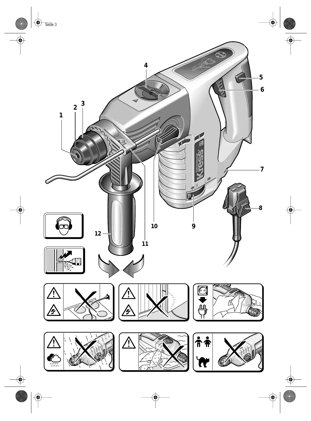 Bevor Sie die Maschine in Betrieb nehmen, lesen Sie die Bedienungsanleitung vollständig durch, befolgen Sie die Sicherheitshinweise in dieser Anleitung sowie die Allgemeinen Sicherheitshinweise für Elektrowerkzeuge im beigelegten Heft. Wird das Netzkabel während der Arbeit beschädigt, sofort Netzstecker ziehen. Niemals mit beschädigtem Netzkabel arbeiten. Schutzbrille, Gehörschutz, Schutzhandschuhe und festes Schuhwerk tragen. Aus Sicherheitsgründen nur mit montiertem Zusatzgriff 12 arbeiten. Kein asbesthaltiges Material bearbeiten. Gerät nicht am Kabel tragen. Steckdosen im Außenbereich müssen über Fehlerstromschutzschalter (FI-) abgesichert sein. Um die Maschine zu kennzeichnen, darf das Gehäuse nicht angebohrt werden. Die Schutzisolation wird überbrückt. Verwenden Sie Klebeschilder. Wenn der Bohrer unerwartet festklemmt, reagiert die Maschine ruckartig. Nehmen Sie deshalb immer einen sicheren Stand ein und halten Sie die Maschine fest mit beiden Händen.