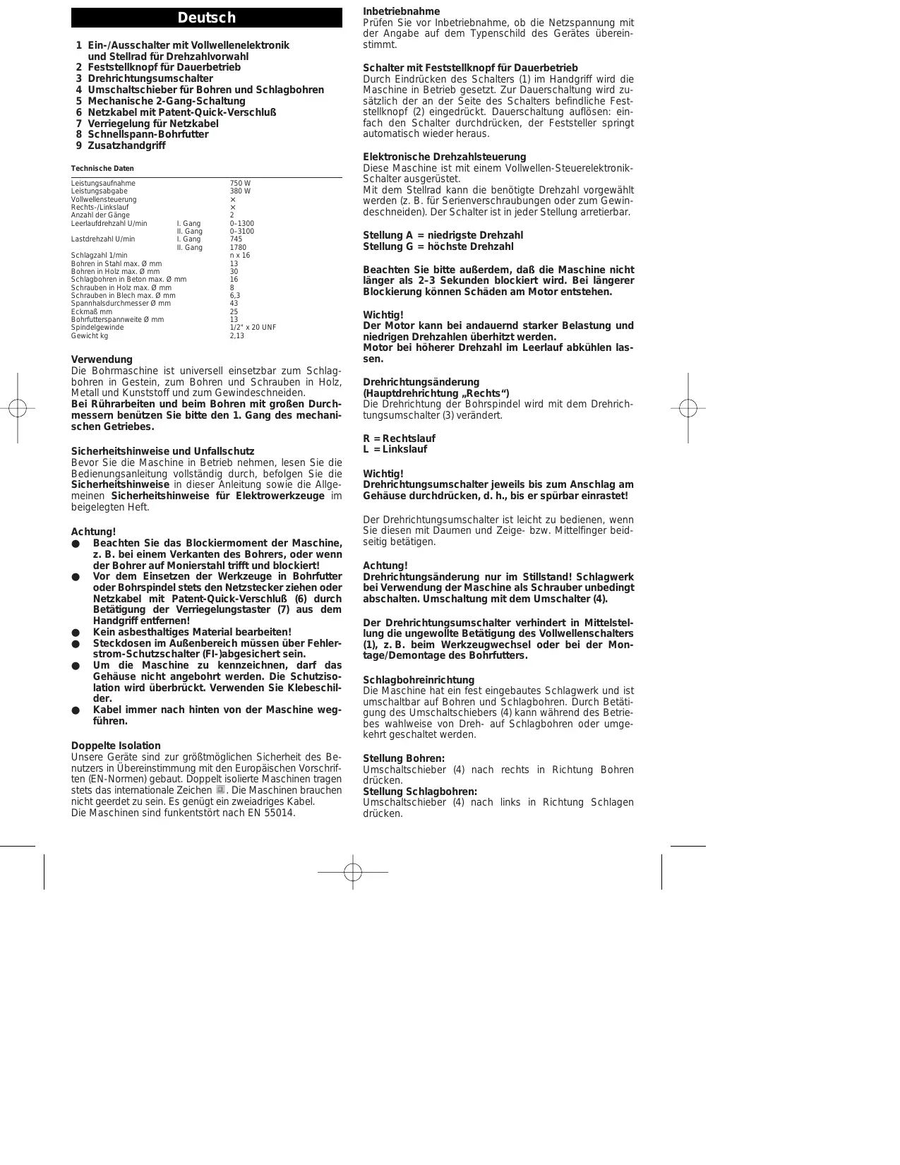 Elektronik-Schlagbohrmaschine Bedienungsanleitung Electronic percussion drill Operating Instructions Perceuse à percussion électronique Mode d’emploi Electronic-Klopboormachine Gebruiksaanwijzing Trapano a percussione elettronico Manuale di servizio Taladradora de percusión electrónica Instrucciones de servicio Elektronisk slagborrmaskin Bruksanvisning Elektronik-slagboremaskine Betjeningsvejledning Elektronisk slagboremaskin Bruksanvisning Sähköiskuporakone Käyttöohje KρουστικÞ δράπανο ηλεκτρονικÞ Oδηγίεσ χρήσησ SBLR 2475 29654/0106 TC Deutsch 1 Ein-/Ausschalter mit Vollwellenelektronik und Stellrad für Drehzahlvorwahl 2 Feststellknopf für Dauerbetrieb 3 Drehrichtungsumschalter 4 Umschaltschieber für Bohren und Schlagbohren 5 Mechanische 2-Gang-Schaltung 6 Netzkabel mit Patent-Quick-Verschluß 7 Verriegelung für Netzkabel 8 Schnellspann-Bohrfutter 9 Zusatzhandgriff Technische Daten Leistungsaufnahme Leistungsabgabe Vollwellensteuerung Rechts-/Linkslauf Anzahl der Gänge Leerlaufdrehzahl U/min Lastdrehzahl U/min