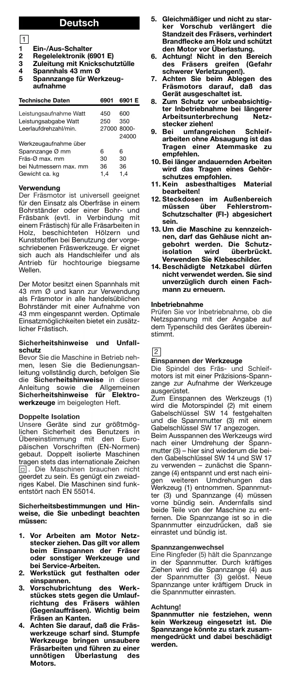 Die zulässige Höchstdrehzahl ist nicht überschritten. Die maximal zulässige Umfangsgeschwindigkeit ist bei einem Schleifkörper- Ø von 30 mm erreicht. Größere Schleifkörper dürfen nicht verwendet werden. Zu beachten ist, daß – die verwendeten Schleifkörper mit Keramik oder Kunstharz gebunden sind, – die Schleifkörper so aufbewahrt werden, daß sie nicht beschädigt werden, – vor Benutzung neuer Schleifkörper ein Probelauf von wenigstens 5 Minuten ohne Belastung durchzuführen ist. Risse im Schleifkörper, beschädigte Werkzeugschäfte usw. können schwerste Verletzungen verursachen! Arbeiten mit der biegsamen Welle Der Fräs- und Schleifmotor ist dank seiner hohen Drehzahl auch vorzüglich als Antrieb für eine biegsame Welle geeignet. Dabei ist zu beachten, daß die zulässige Leerlaufdrehzahl der Biegewelle der Leerlaufdrehzahl des Fräs- und Schleifmotors angepaßt sein muß. Motor mit einem handelsüblichen Horizontalständer an Tisch oder Werkbank befestigen. Achtung! Schutzbrille tragen! Vollwellen-Regelelektronik 6901 E (Sicherheitselektronik) Die Vollwellen-Regelelektronik ermöglicht einen großen Regelbereich von 8000 – 24000/min. Die Drehzahl sinkt auch bei Nennleistung nur geringfügig ab (auf ca. 22500/min.). Es kann also unabhängig von – Material (z.B. Hartholz, Weichholz, Kunststoff) und – Fräs- bzw. Schleifwerkzeugen (z.B. kleiner Durchmesser, großer Durchmesser, geringe Qualität, hochwertige Qualität), immer die optimale Schnittgeschwindigkeit bzw. Arbeitsdrehzahl eingestellt werden. Durch die Leerlaufdrehzahlbegrenzung ist das Gerät sehr umweltfreundlich. Die Leerlaufdrehzahlen sind aus der an der Maschine angebrachten Tabelle ersichtlich. Schnittgeschwindigkeit bzw. Arbeitsdrehzahl sind von sehr vielen Faktoren abhängig (z.B. unterschiedlicher Härte des zu bearbeitenden Materials, Fräserqualität, Vorschub, usw.), so daß eine Empfehlung zur Drehzahleinstellung nicht gegeben werden kann. Die optimale Drehzahleinstellung ist zu Beginn der Fräsarbeiten durch Versuche zu ermitteln. Hinweis! Sehr hohe Drehzahlen bedeuten schnelle Abnützung und kleine Standzeit der Werkzeuge! Wichtig! Nur scharfe und gut erhaltene Fräswerkzeuge verwenden! Beachten Sie, daß die auf den sich drehenden Werkzeugen vom Hersteller dauerhaft angebrachten Drehzahlen je Minute nicht überschritten werden dürfen! Sicherheitselektronik 6901 E In die Vollwellen-Regelelektronik ist ein elektronischer Stromsensor integriert. Wird der Motor durch zu großen Andruck oder durch Verkanten überlastet, reduziert die Elektronik die Stromaufnahme. Die Drehzahl verringert sich. Wird das Fräs- bzw. Schleifwerkzeug wieder frei, regelt die Elektronik die Drehzahl automatisch wieder hoch auf den eingestellten Wert. Durch diesen elektronischen Stromsensor bekommt man auch ein Gefühl für den optimalen Arbeitsdruck. Dadurch wird das Gerät überlastungssicher. Das ist die Gewähr für eine lange Lebensdauer. Auswechseln der Kohlebürsten Diese Arbeit und alle weiteren Servicearbeiten führen unsere Servicestellen schnell und sachgemäß aus. Netzkabel Beschädigte Netzkabel dürfen nicht verwendet werden. Sie sind unverzüglich durch einen Fachmann zu erneuern. Motor, Reinigung und Pflege Der kräftige Universalmotor hat genügend Kraftreserven. Er dankt es Ihnen durch lange Lebensdauer, wenn Sie nach jeder Arbeit den Staub aus dem Gebläse blasen. Die Lüftungsöffnungen sind stets frei und sauber zu halten, da eine gleichbleibende Ventilation wichtig ist. Die Maschine ist dauergeschmiert und weitgehend wartungsfrei. Werkzeugpflege Sorgen Sie dafür, daß nur scharfe und gut erhaltene Fräswerkzeuge verwendet werden. Sie schonen damit den Motor und verlängern die Lebensdauer der Maschine. Hartmetallbestückte Fräser erfordern eine besonders sorgfältige Behandlung, da die Schneiden leicht ausbrechen können. Beschädigte Fräs-, Schleif- und Polierwerkzeuge dürfen wegen des Verletzungsrisikos auf unserem hochtourigen Fräs- und Schleifmotor nicht mehr zum Einsatz gebracht werden! Lärm-/Vibrationsinformation Meßwerte ermittelt entsprechend EN 50144. Schalldruckpegel: 70+3 dB (A) Schalleistungspegel: 83+3 dB (A) Arbeitsplatzbezogener Emissionswert: 73+3 dB (A) Für den Bedienenden sind Schallschutzmaßnahmen erforderlich. Die bewertete Beschleunigung beträgt typischerweise 3,7 m/s2. Sonderzubehör: Spannzange 6 mm, 8 mm, 1/4“ Sichtschutz Änderungen, die dem technischen Fortschritt dienen, bleiben vorbehalten. English