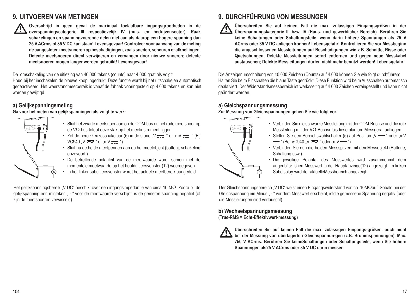 - Onderliggende functie (1 s indrukken): Inschakelen van de achtergrondverlichting voor het uitleesvenster op niveau 1. Opnieuw kort drukken schakelt door naar niveau 2 en nogmaals drukken schakelt de achtergrondverlichting uit. h) Temperaturmessung Überschreiten Sie auf keinen Fall die max. zulässigen Eingangsgrößen. Berühren Sie keine Schaltungen oder Schaltungsteile, wenn höhere Spannungen als 25 V ACrms oder 35 V DC darin vorkommen können. Temperaturmessungen können nur an den Anschlussbuchsen „V°C“ = Plus und „COM“ = Minus und nur mit K-Typ-Thermofühlern durchgeführt werden. Die Temperaturen dürfen nur am Fühler angelegt werden; Das Messgerät ist nur bei einer Umgebungstemperatur von 23°C (+/- 5°C) spezifiziert (garantierte Genauigkeit). Zur Messung von Temperaturen gehen Sie wie folgt vor: