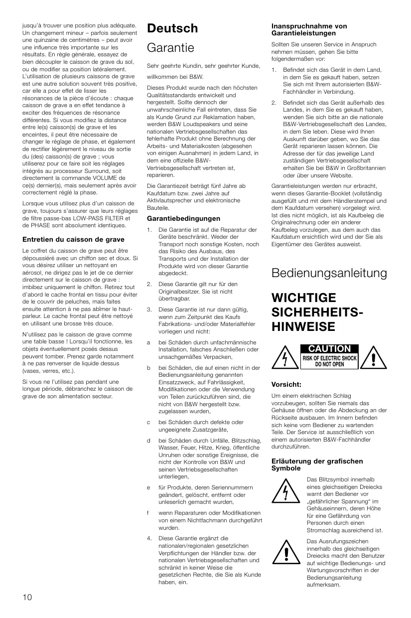 WICHTIGE SICHERHEITSHINWEISE CAUTION RISK OF ELECTRIC SHOCK DO NOT OPEN Vorsicht: Um einem elektrischen Schlag vorzubeugen, sollten Sie niemals das Gehäuse öffnen oder die Abdeckung an der Rückseite ausbauen. Im Innern befinden sich keine vom Bediener zu wartenden Teile. Der Service ist ausschließlich von einem autorisierten B&W-Fachhändler durchzuführen.
