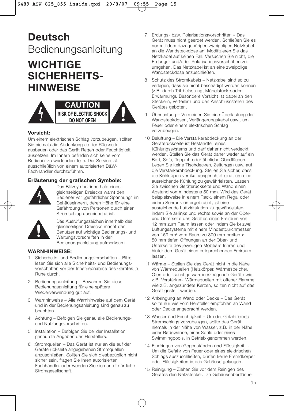 Um einem elektrischen Schlag vorzubeugen, soliten Sie niemals die Abdeckung an der Rückseite ausbauen oder das Gerät Regen oder Feuchtigkeit aussetzen. Im Innern befinden sich keine vom Bediener zu wartenden Teile. Der Service ist ausschlieBlich von einem autorisierten B&W- Fachhändier durchzuführen.