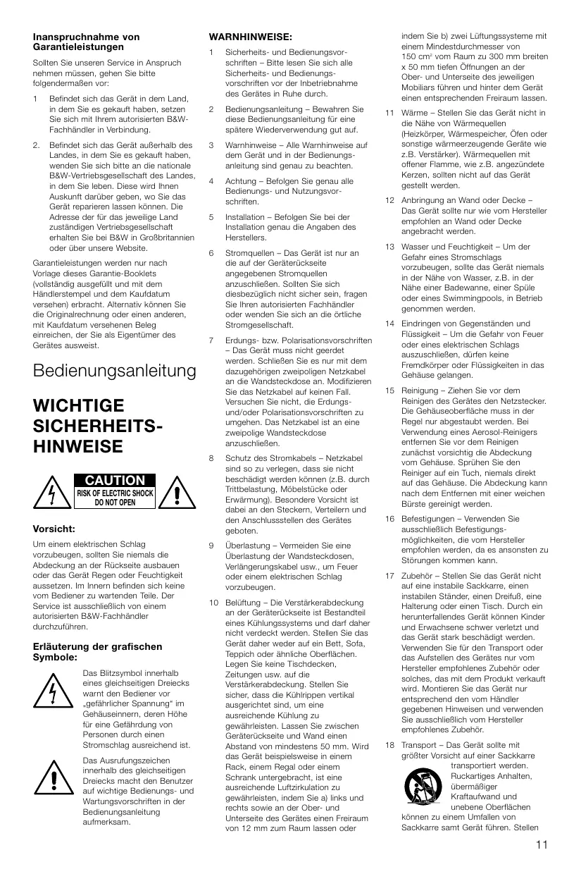 CAUTION RISK OF ELECTRIC SHOCK DO NOT OPEN Vorsicht: Um einem elektrischen Schlag vorzubeugen, sollten Sie niemals die Abdeckung an der Rückseite ausbauen oder das Gerät Regen oder Feuchtigkeit aussetzen. Im Innern befinden sich keine vom Bediener zu wartenden Teile. Der Service ist ausschließlich von einem autorisierten B&W-Fachhändler durchzuführen.