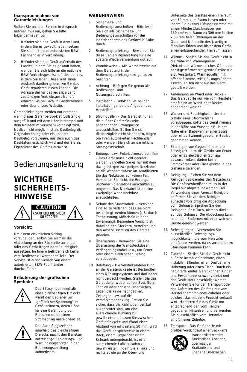 RISK OF ELECTRIC SHOCK DO NOT OPEN Vorsicht: Um einem elektrischen Schlag vorzubeugen, sollten Sie niemals die Abdeckung an der Rückseite ausbauen oder das Gerät Regen oder Feuchtigkeit aussetzen. Im Innern befinden sich keine vom Bediener zu wartenden Teile. Der Service ist ausschließlich von einem autorisierten B&W-Fachhändler durchzuführen.