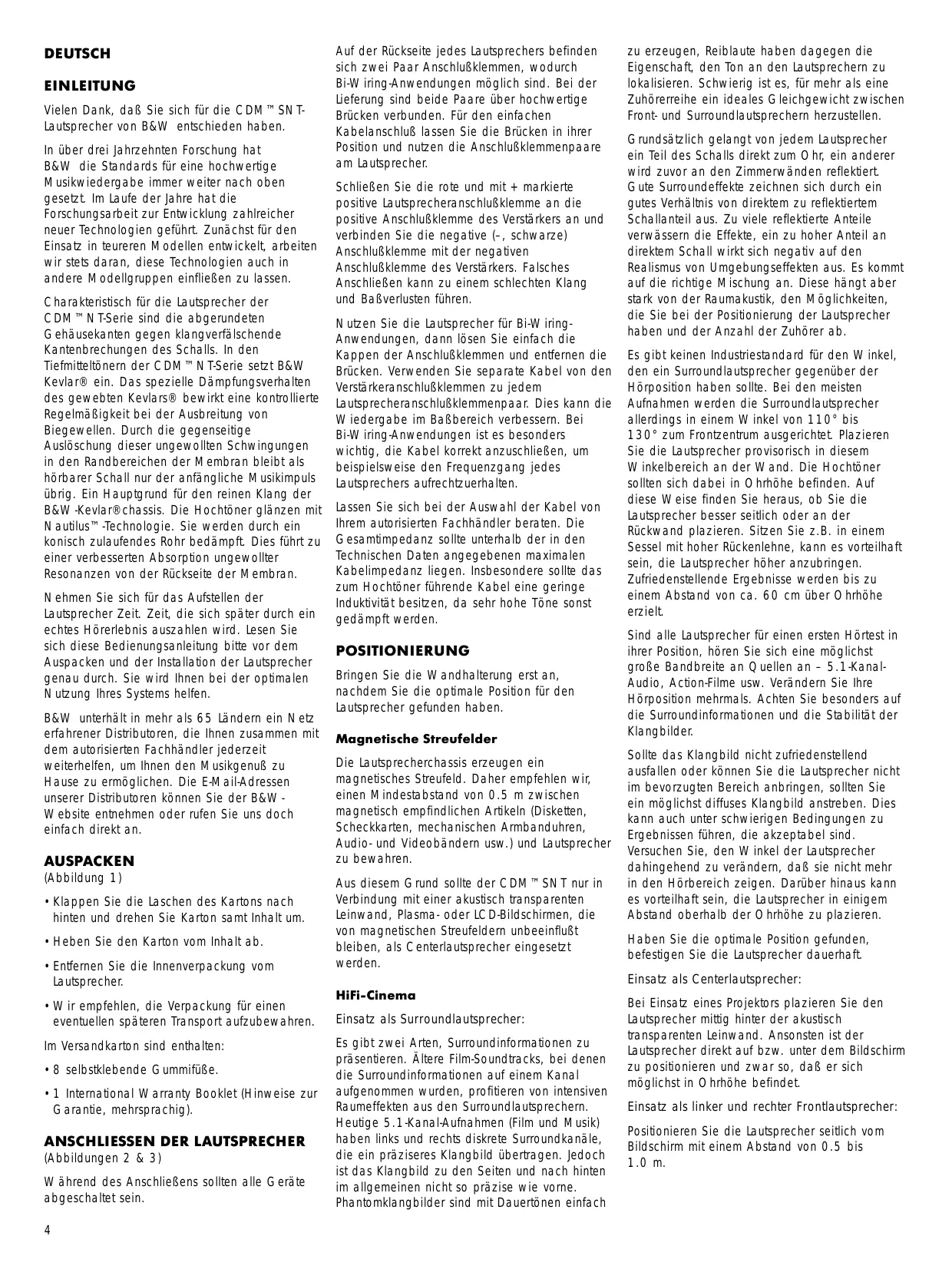DEUTSCH EINLEITUNG Vielen Dank, daß Sie sich für die CDM™SNTLautsprecher von B&W entschieden haben. In über drei Jahrzehnten Forschung hat B&W die Standards für eine hochwertige Musikwiedergabe immer weiter nach oben gesetzt. Im Laufe der Jahre hat die Forschungsarbeit zur Entwicklung zahlreicher neuer Technologien geführt. Zunächst für den Einsatz in teureren Modellen entwickelt, arbeiten wir stets daran, diese Technologien auch in andere Modellgruppen einfließen zu lassen. Charakteristisch für die Lautsprecher der CDM™NT-Serie sind die abgerundeten Gehäusekanten gegen klangverfälschende Kantenbrechungen des Schalls. In den Tiefmitteltönern der CDM™NT-Serie setzt B&W Kevlar® ein. Das spezielle Dämpfungsverhalten des gewebten Kevlars® bewirkt eine kontrollierte Regelmäßigkeit bei der Ausbreitung von Biegewellen. Durch die gegenseitige Auslöschung dieser ungewollten Schwingungen in den Randbereichen der Membran bleibt als hörbarer Schall nur der anfängliche Musikimpuls übrig. Ein Hauptgrund für den reinen Klang der B&W-Kevlar®chassis. Die Hochtöner glänzen mit Nautilus™-Technologie. Sie werden durch ein konisch zulaufendes Rohr bedämpft. Dies führt zu einer verbesserten Absorption ungewollter Resonanzen von der Rückseite der Membran. Nehmen Sie sich für das Aufstellen der Lautsprecher Zeit. Zeit, die sich später durch ein echtes Hörerlebnis auszahlen wird. Lesen Sie sich diese Bedienungsanleitung bitte vor dem Auspacken und der Installation der Lautsprecher genau durch. Sie wird Ihnen bei der optimalen Nutzung Ihres Systems helfen. B&W unterhält in mehr als 65 Ländern ein Netz erfahrener Distributoren, die Ihnen zusammen mit dem autorisierten Fachhändler jederzeit weiterhelfen, um Ihnen den Musikgenuß zu Hause zu ermöglichen. Die E-Mail-Adressen unserer Distributoren können Sie der B&WWebsite entnehmen oder rufen Sie uns doch einfach direkt an.