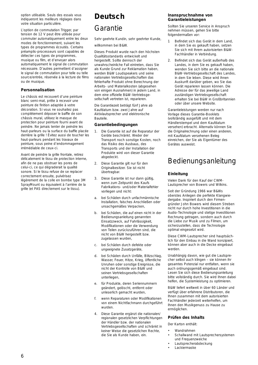 Bedienungsanleitung Einleitung Vielen Dank für den Kauf der CWMLautsprecher von Bowers und Wilkins. Seit der Gründung 1966 war B&Ws oberstes Anliegen die perfekte Klangwiedergabe. Inspiriert durch den Firmengründer John Bowers wird diesem Streben nicht nur durch hohe Investitionen in die Audio-Technologie und stetige Investitionen Rechnung getragen, sondern auch durch die Liebe zur Musik und zu Filmen, um sicherzustellen, dass die Technologie optimal eingesetzt wird. Diese CWM-Lautsprecher sind hauptsächlich für den Einbau in die Wand konzipiert, können aber auch in die Decke eingebaut werden. Unabhängig davon, wie gut die Lautsprecher selbst auch klingen – sie können ihr gesamtes Potenzial nur entfalten, wenn sie auch ordnungsgemäß eingebaut sind. Lesen Sie sich diese Bedienungsanleitung bitte vollständig durch. Sie wird Ihnen dabei helfen, die Systemleistung zu optimieren. B&W liefert weltweit in über 60 Länder und verfügt über erfahrene Distributoren, die Ihnen zusammen mit dem autorisierten Fachhändler jederzeit weiterhelfen, um Ihnen den Musikgenuss zu Hause zu ermöglichen.