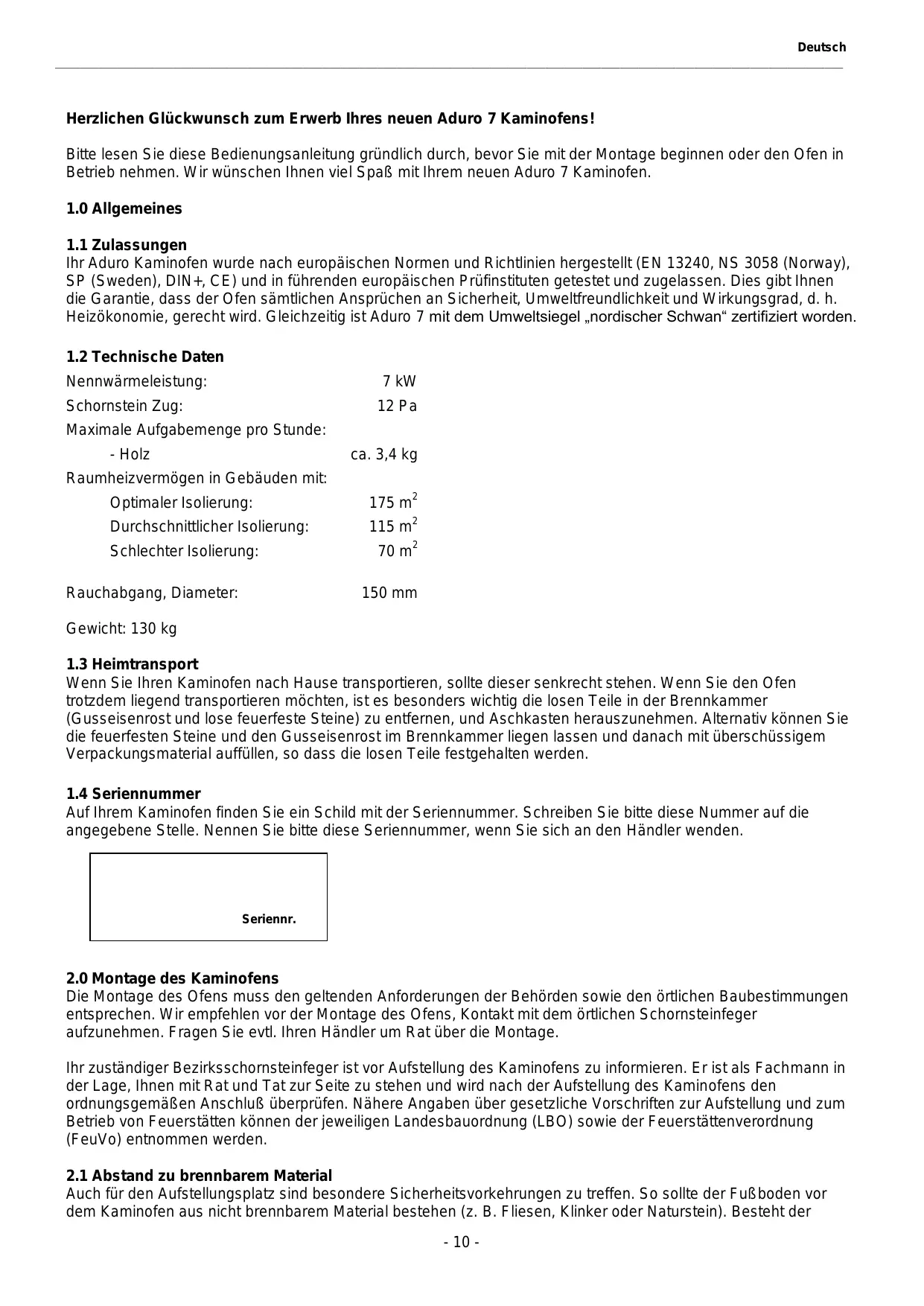 Auf Ihrem Kaminofen finden Sie ein Schild mit der Seriennummer. Schreiben Sie bitte diese Nummer auf die angegebene Stelle. Nennen Sie bitte diese Seriennummer, wenn Sie sich an den Händler wenden. Seriennr.