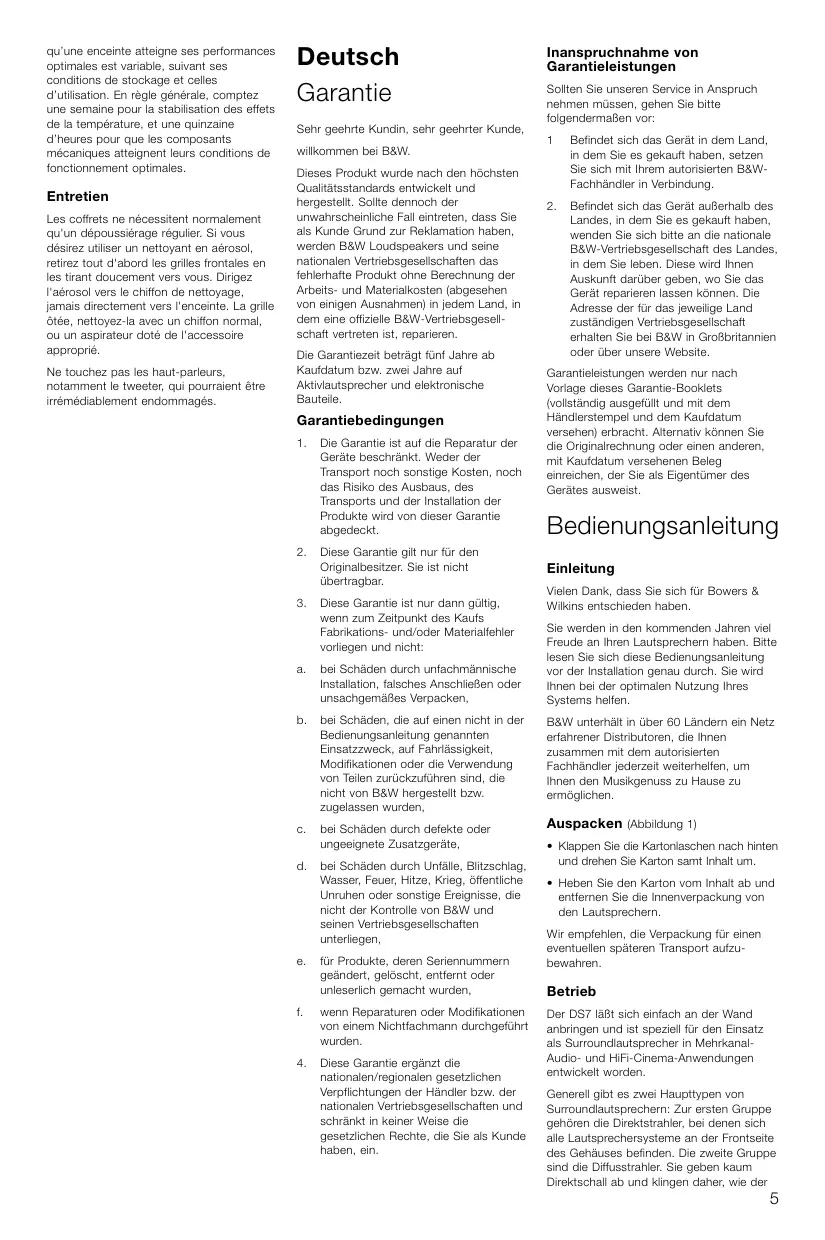 Befindet sich das Gerät außerhalb des Landes, in dem Sie es gekauft haben, wenden Sie sich bitte an die nationale B&W-Vertriebsgesellschaft des Landes, in dem Sie leben. Diese wird Ihnen Auskunft darüber geben, wo Sie das Gerät reparieren lassen können. Die Adresse der für das jeweilige Land zuständigen Vertriebsgesellschaft erhalten Sie bei B&W in Großbritannien oder über unsere Website. willkommen bei B&W. Dieses Produkt wurde nach den höchsten Qualitätsstandards entwickelt und hergestellt. Sollte dennoch der unwahrscheinliche Fall eintreten, dass Sie als Kunde Grund zur Reklamation haben, werden B&W Loudspeakers und seine nationalen Vertriebsgesellschaften das fehlerhafte Produkt ohne Berechnung der Arbeits- und Materialkosten (abgesehen von einigen Ausnahmen) in jedem Land, in dem eine offizielle B&W-Vertriebsgesellschaft vertreten ist, reparieren. Die Garantiezeit beträgt fünf Jahre ab Kaufdatum bzw. zwei Jahre auf Aktivlautsprecher und elektronische Bauteile. Garantiebedingungen