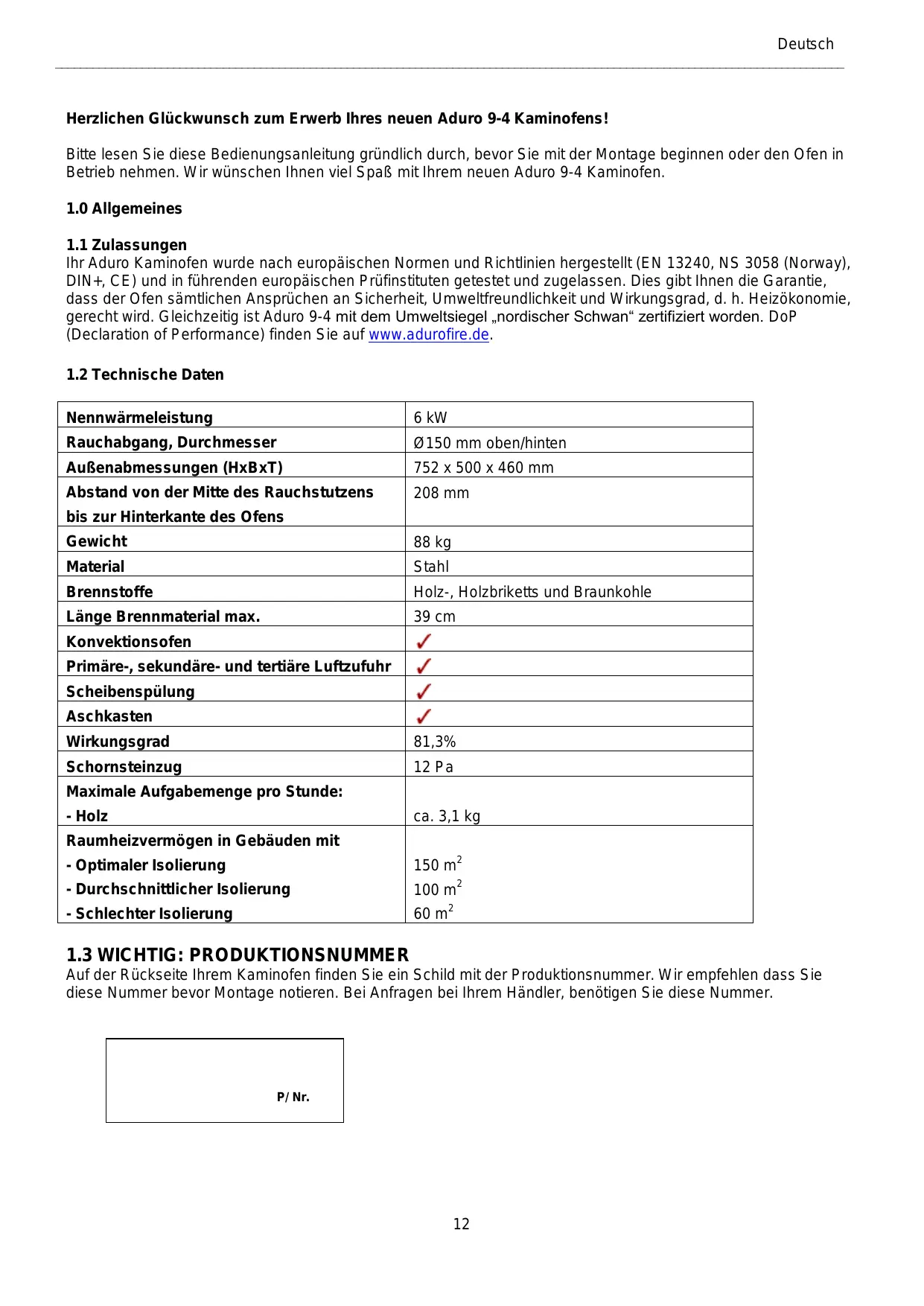 Auf der Rückseite Ihrem Kaminofen finden Sie ein Schild mit der Produktionsnummer. Wir empfehlen dass Sie diese Nummer bevor Montage notieren. Bei Anfragen bei Ihrem Händler, benötigen Sie diese Nummer. P/ Nr.