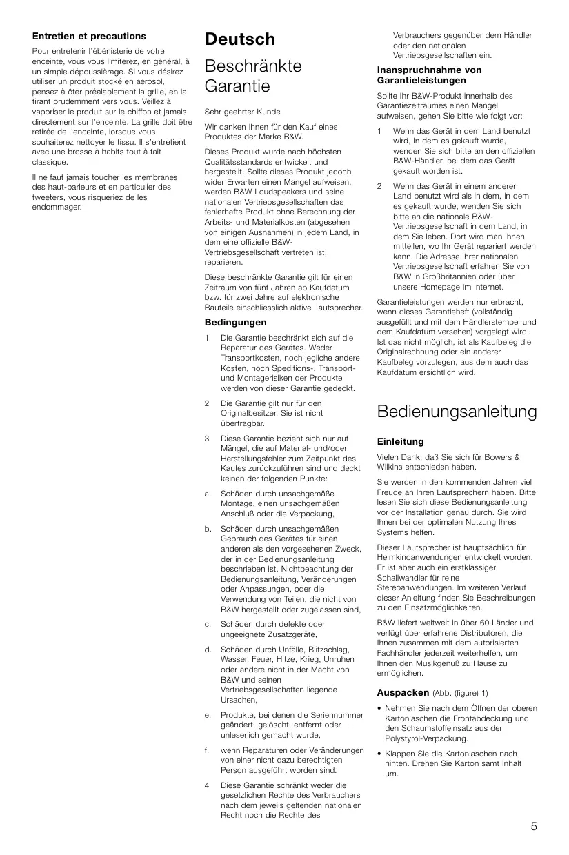 Toutefois, en cas de problème, B&W Loudspeakers et ses distributeurs nationaux garantissent une main d’œuvre (exclusions possibles) et des pièces de rechange gratuites dans tout pays desservi par un distributeur agréé de B&W. Cette garantie limitée est valide pour une période de cinq ans à compter de la date d’achat ou une période de deux ans pour les composants électroniques, y compris les haut-parleurs amplifiés.